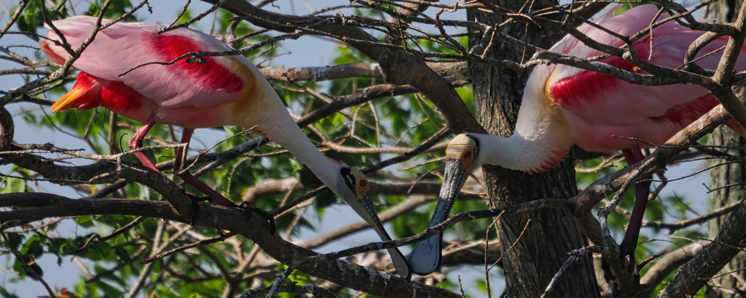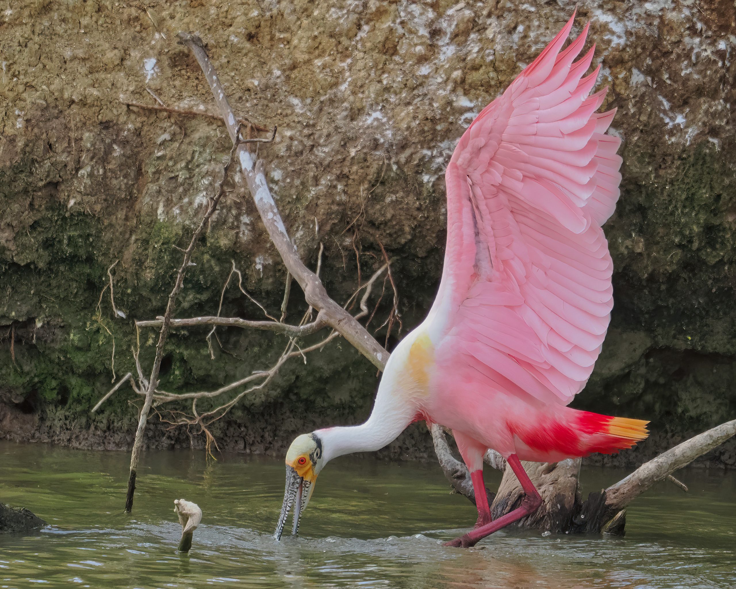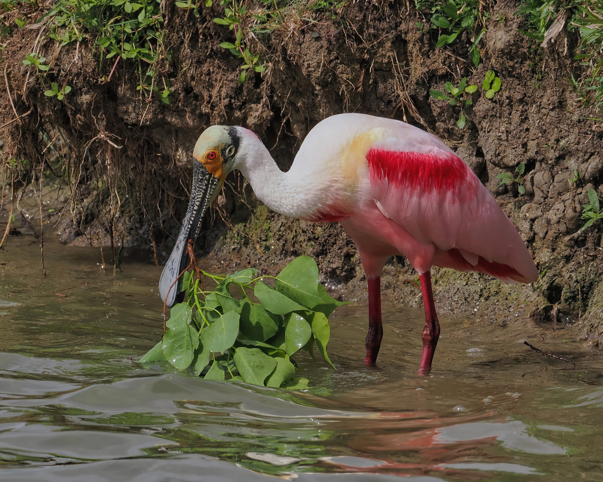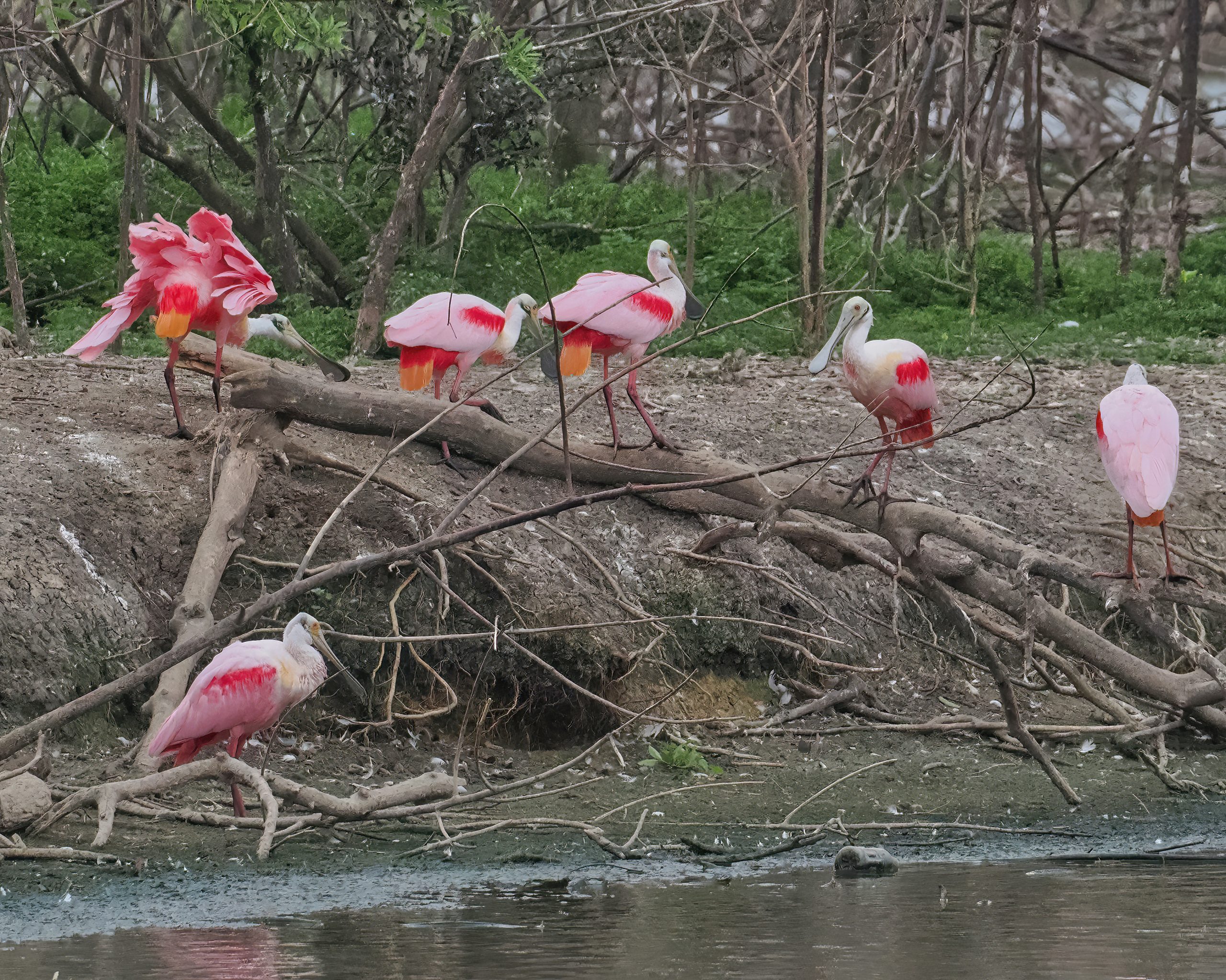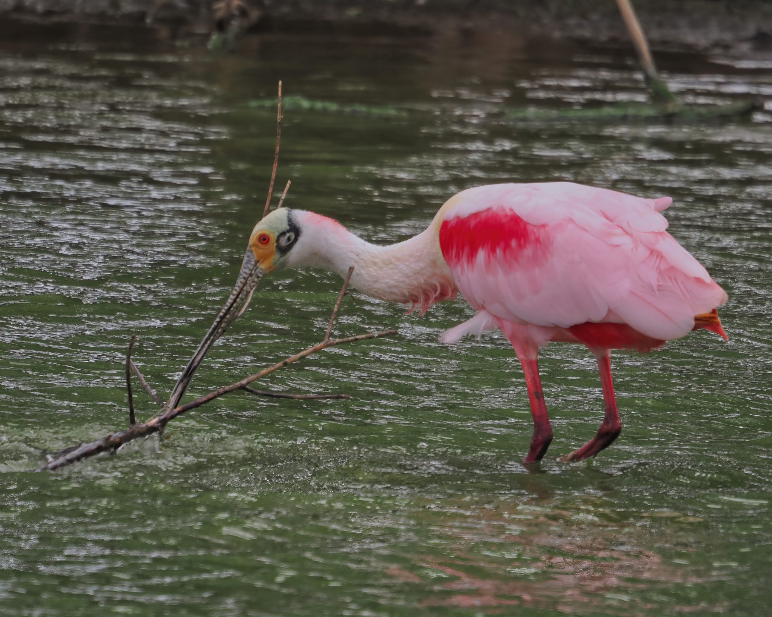 Roseate Spoonbill considering a branch for its nest, later rejected, too far to carry such a big branch, I guess. Notice the filigree pattern on the bird