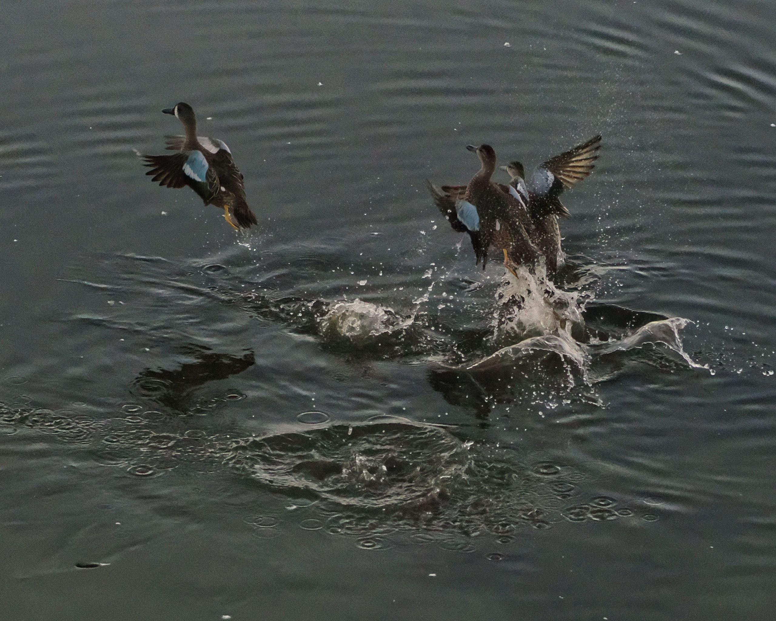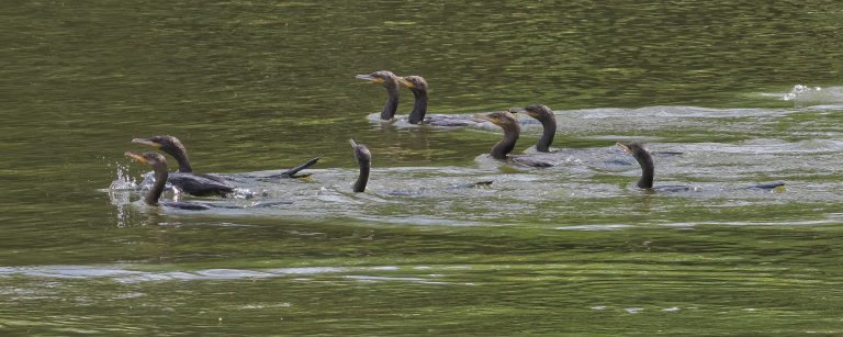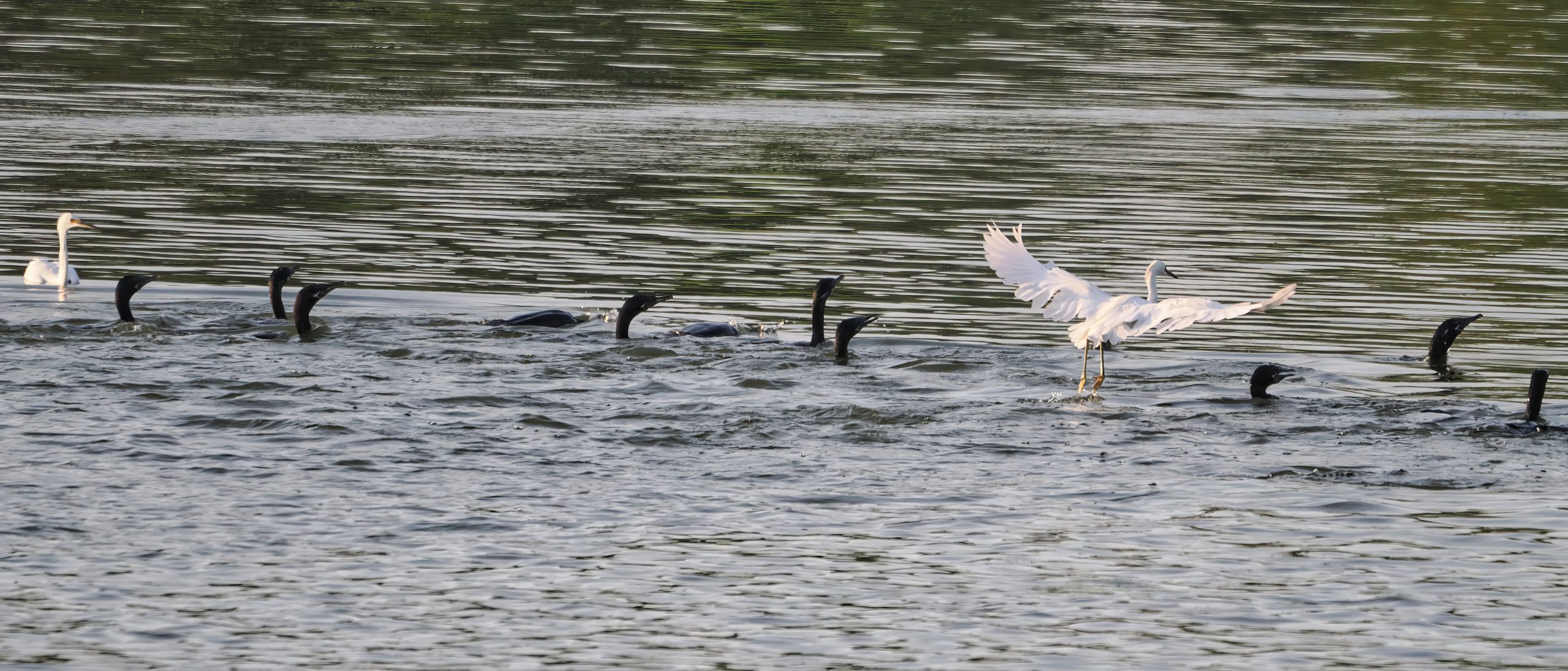 A gulp of Cormorants following a school of fish with a couple Egrets snagging a few, too. Notice a couple Cormorants head down in the water. John Hargrove Environmental Complex (AKA Delores Fenwick Nature Center), Pearland, Texas.