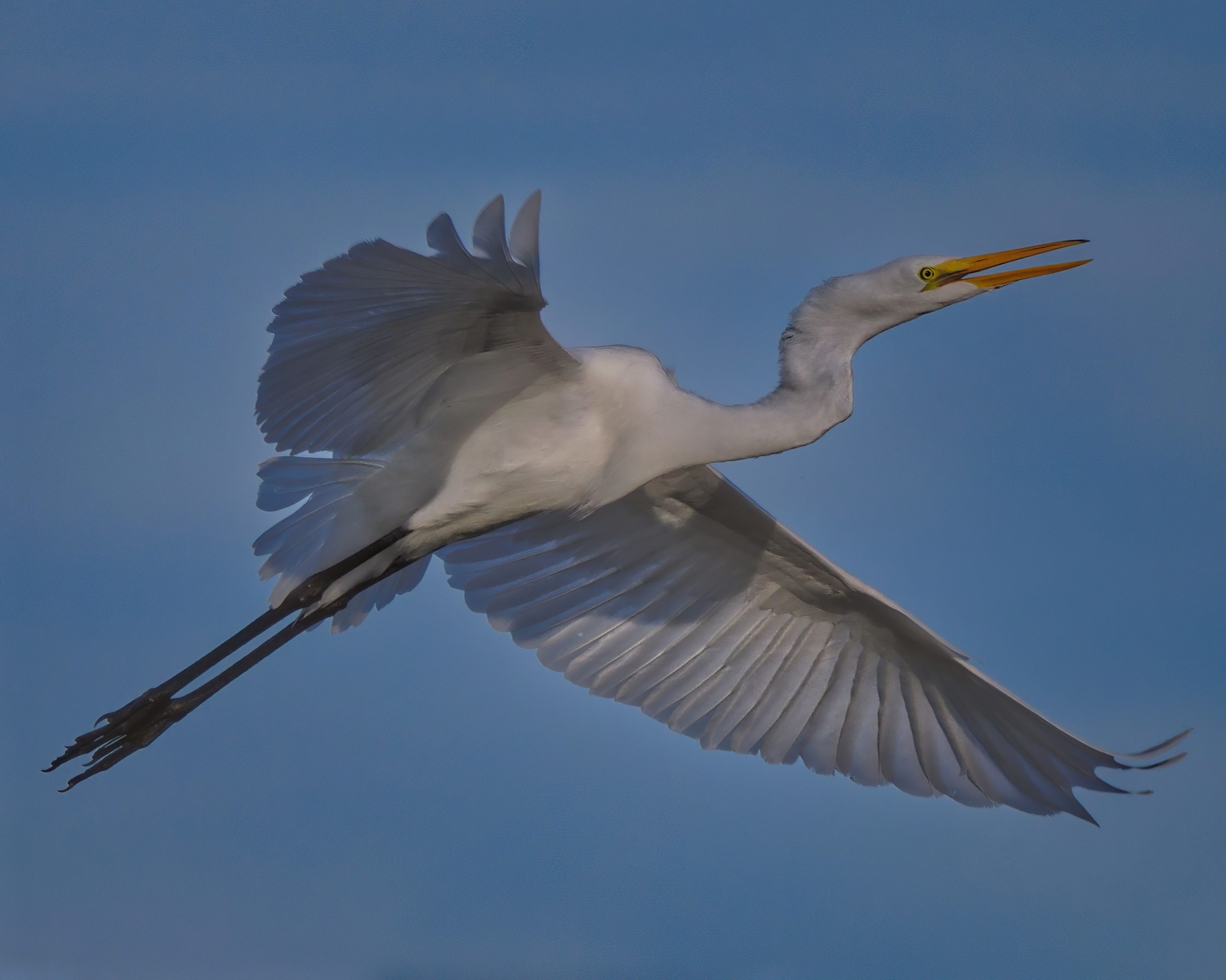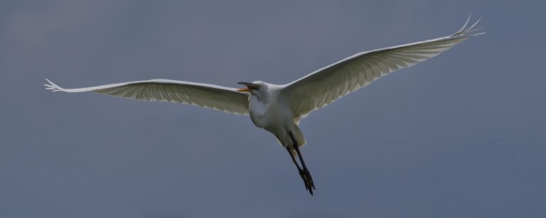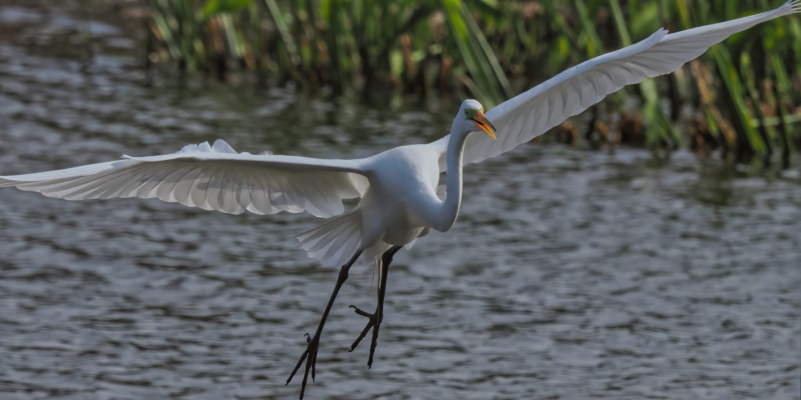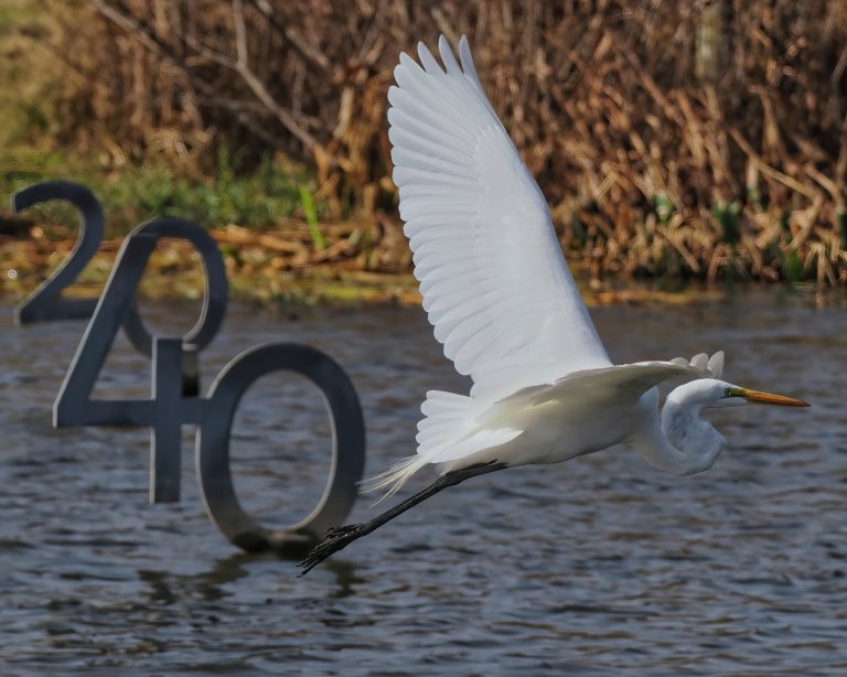 The dominant Great Egret of Riverstone Wetlands is flying to confront (and drive off) a competitor. Zoom into the green lore around the eye, evidence of his breeding status. Sugar Land, Texas.