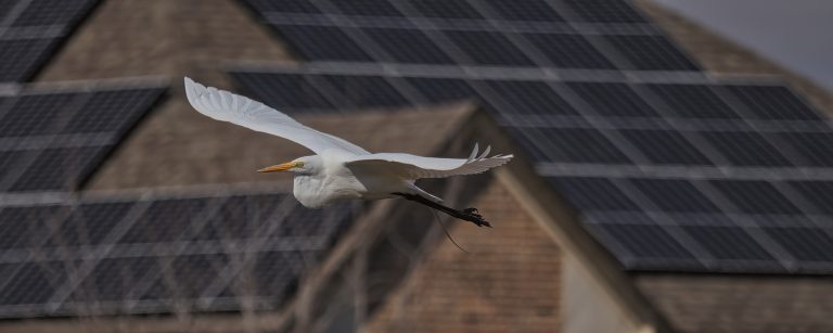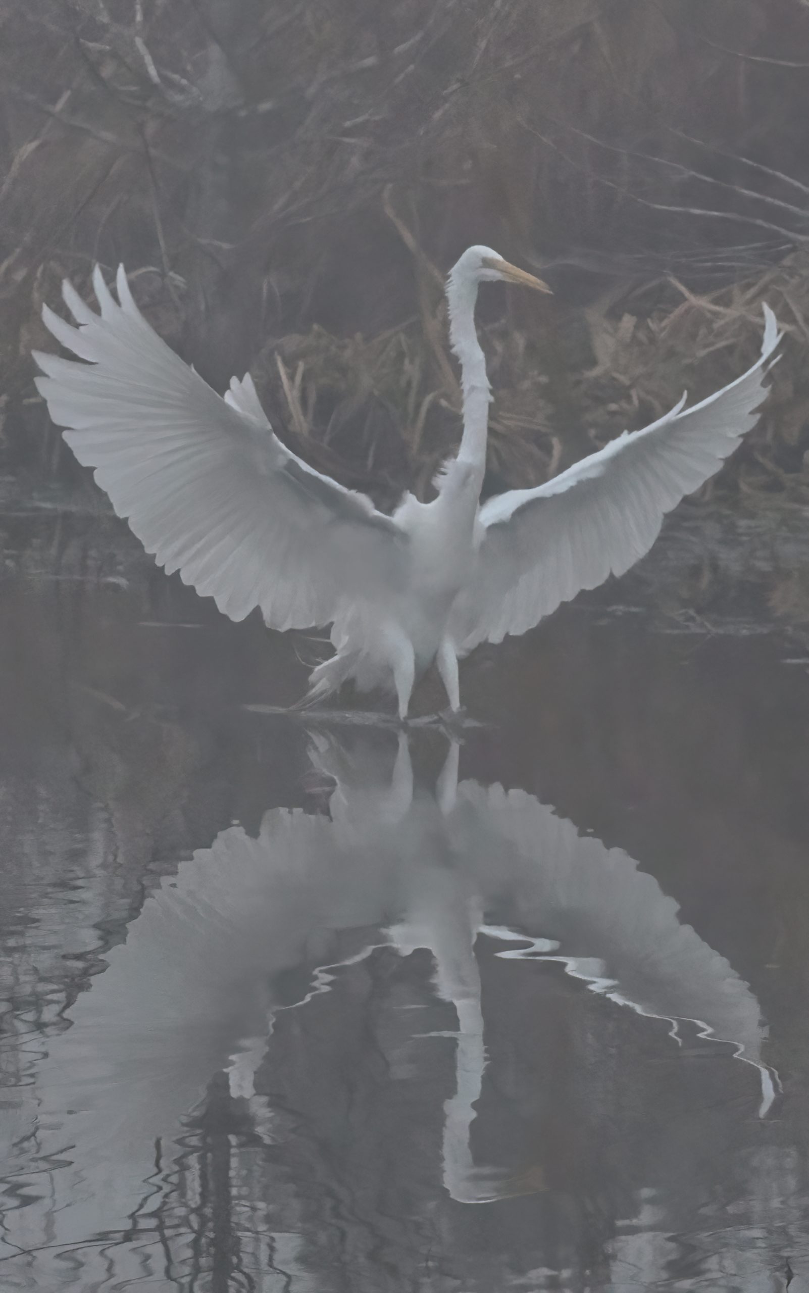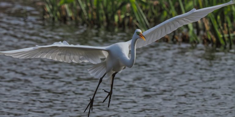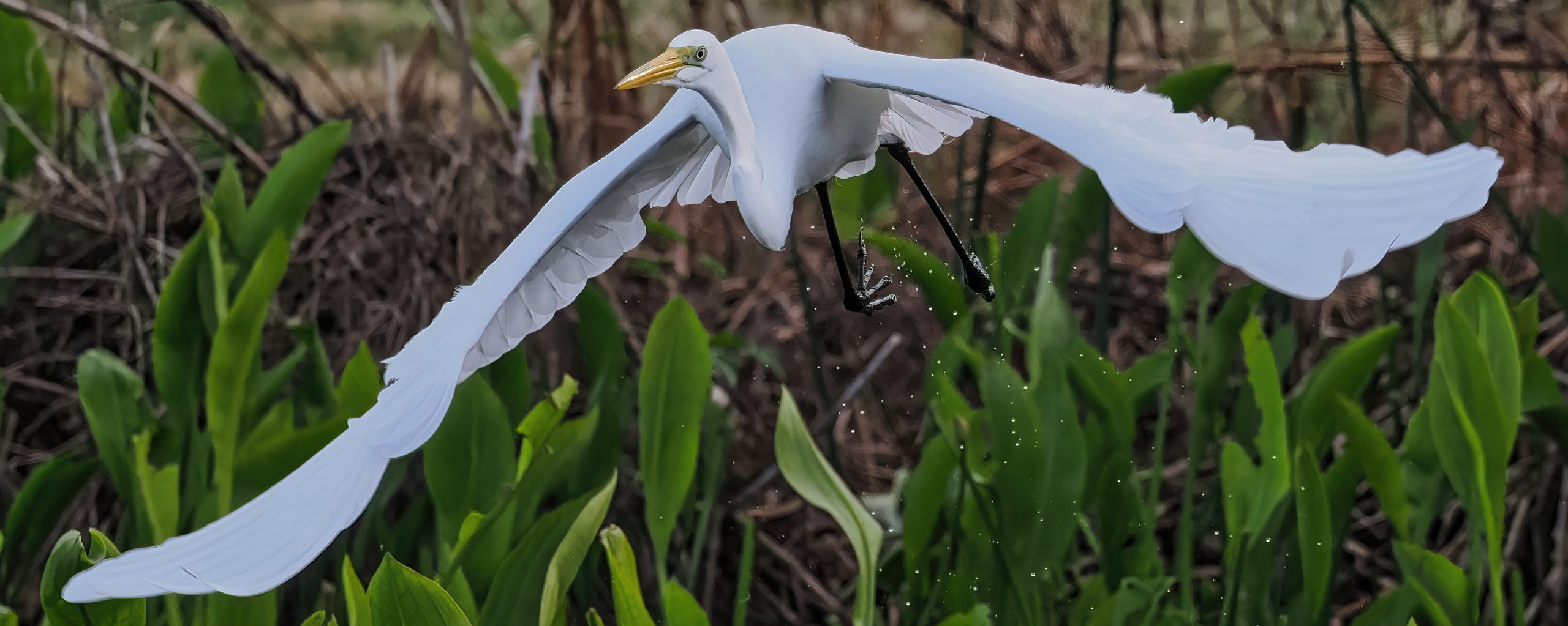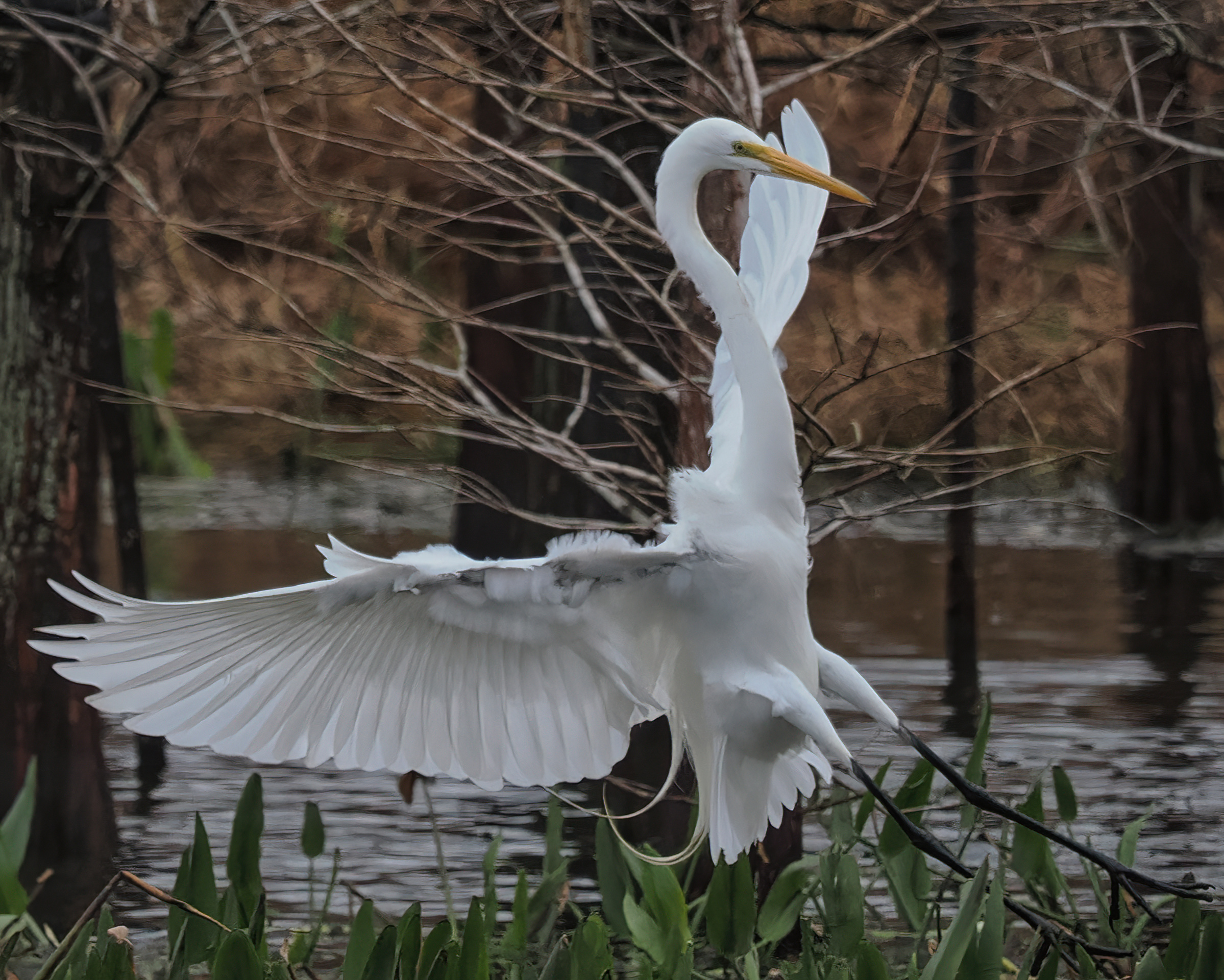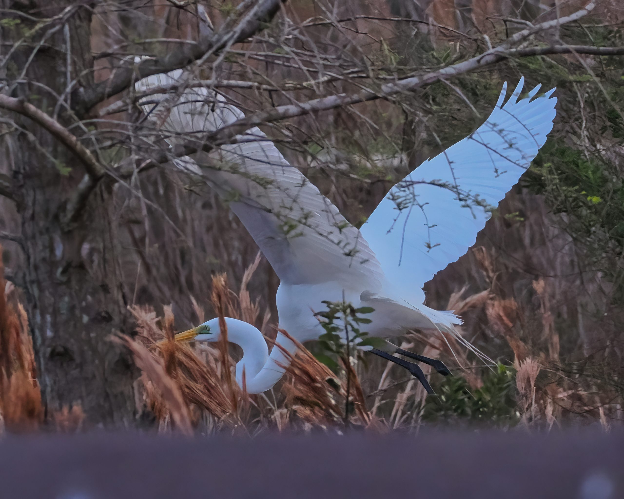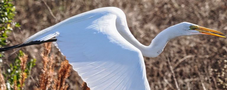 Great Egret flying through the bush at Riverstone Wetlands, Sugar Land, Texas.