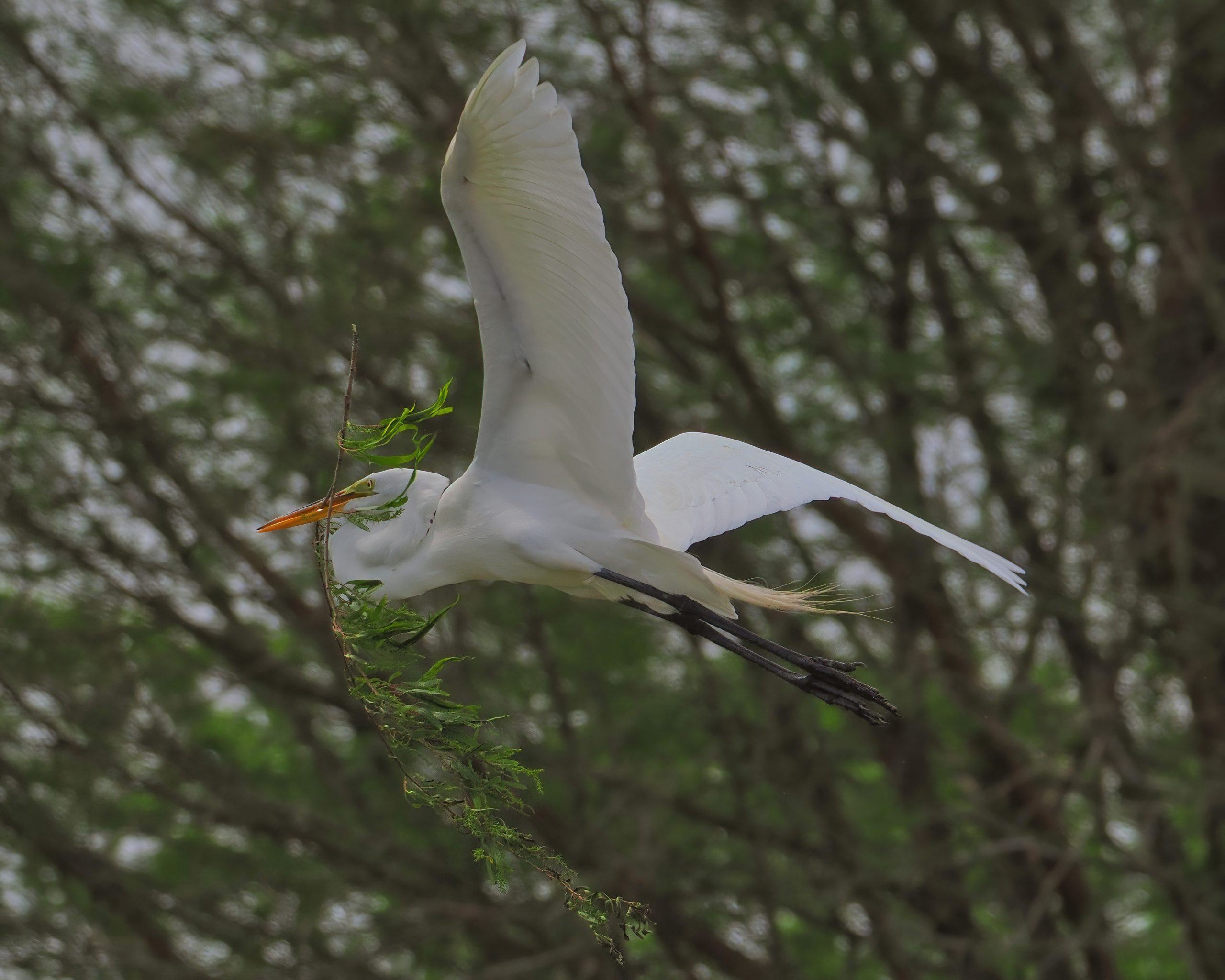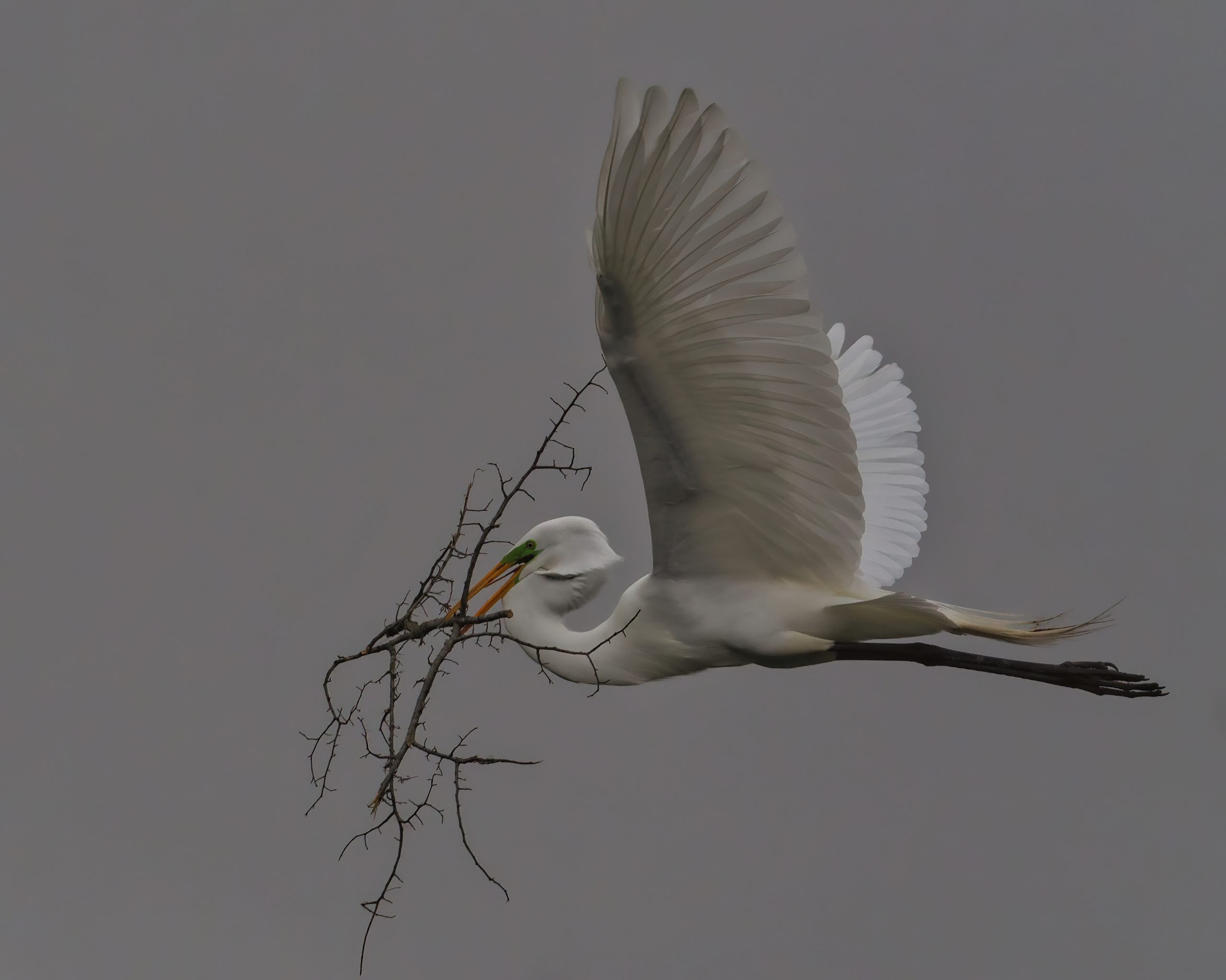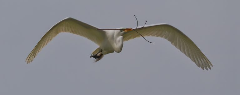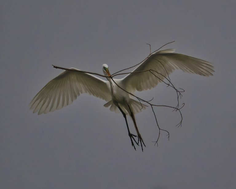Great Egret carrying a large branch for the rookery on a dreary morning. Resoft County Park, Alvin, Texas.
