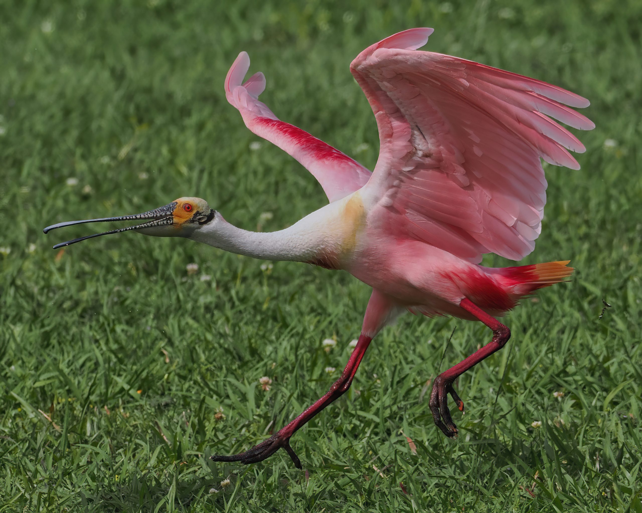 Roseate Spoonbill outraged at an interloper in his connubial territory. Resoft County Park, Alvin, Texas