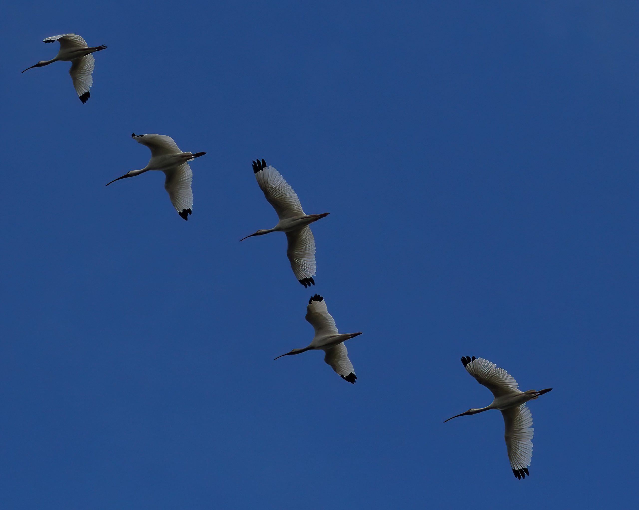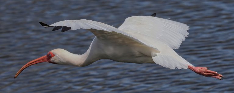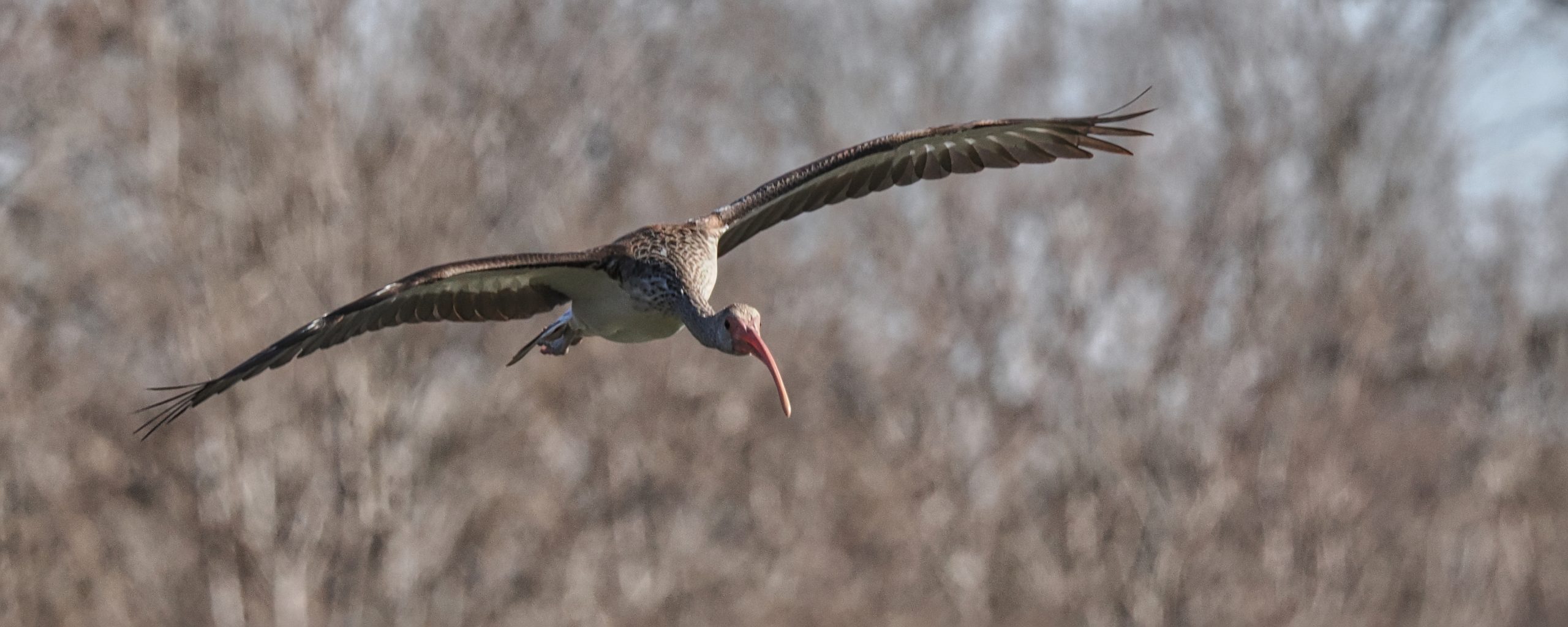 Juvenile White Ibis in flight, not yet in adult plumage. Riverstone Wetlands, Sugar Land, Texas.