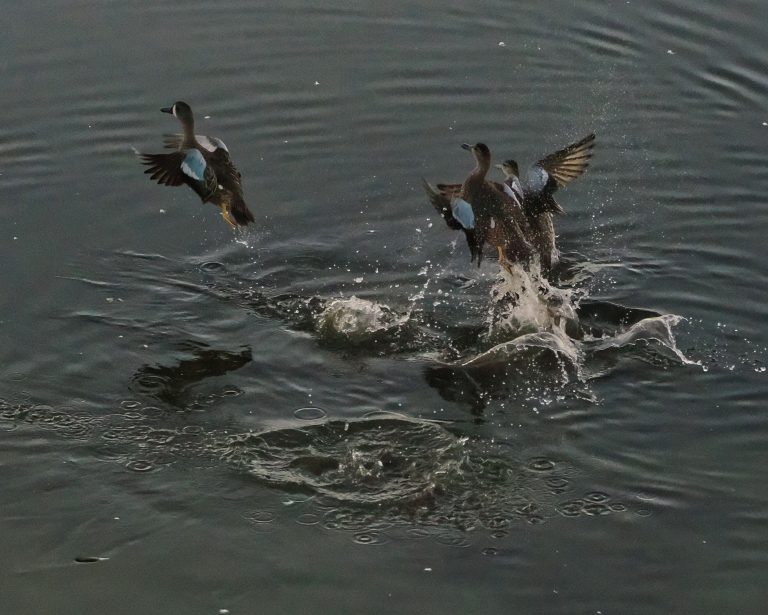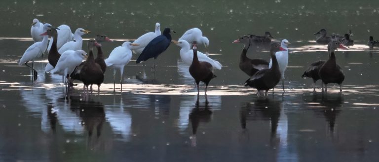 Cattle Egrets, Little Blue Herons, Black-bellied Whistling Ducks. Delores Fenwick Nature Center, Pearland, Texas.