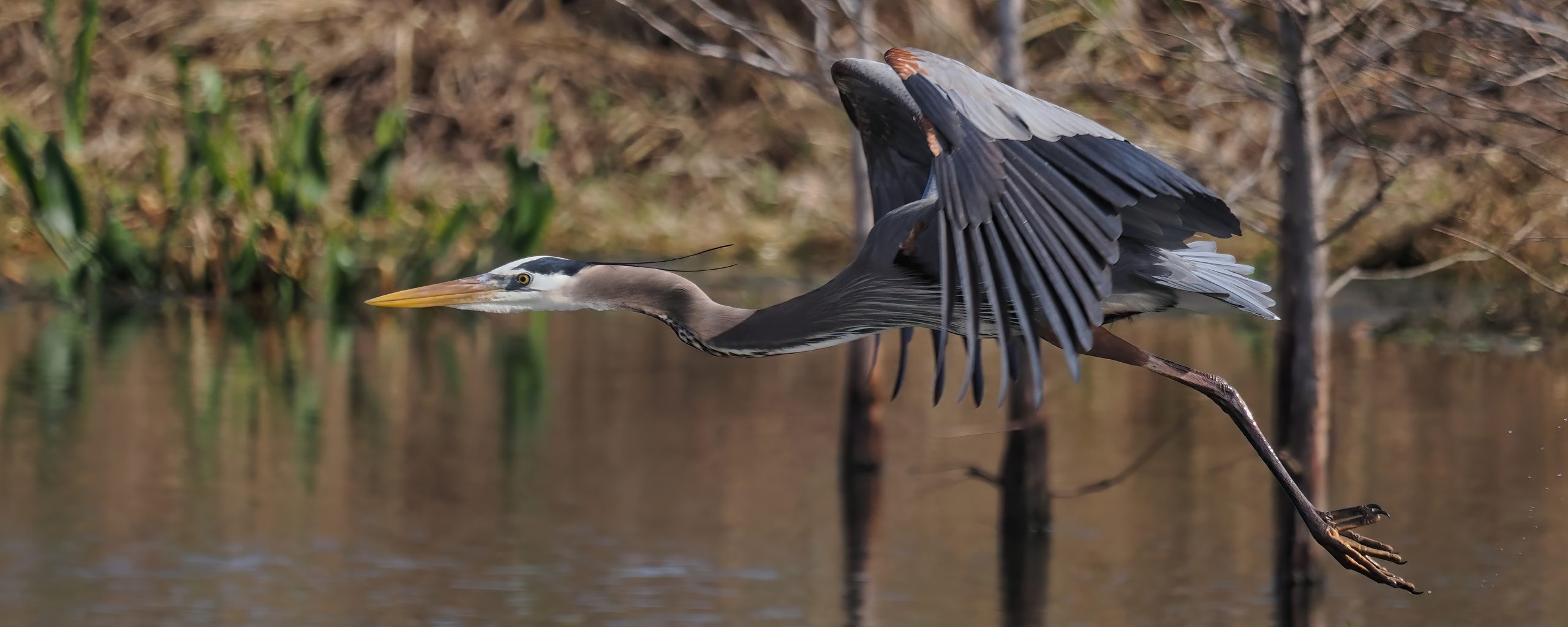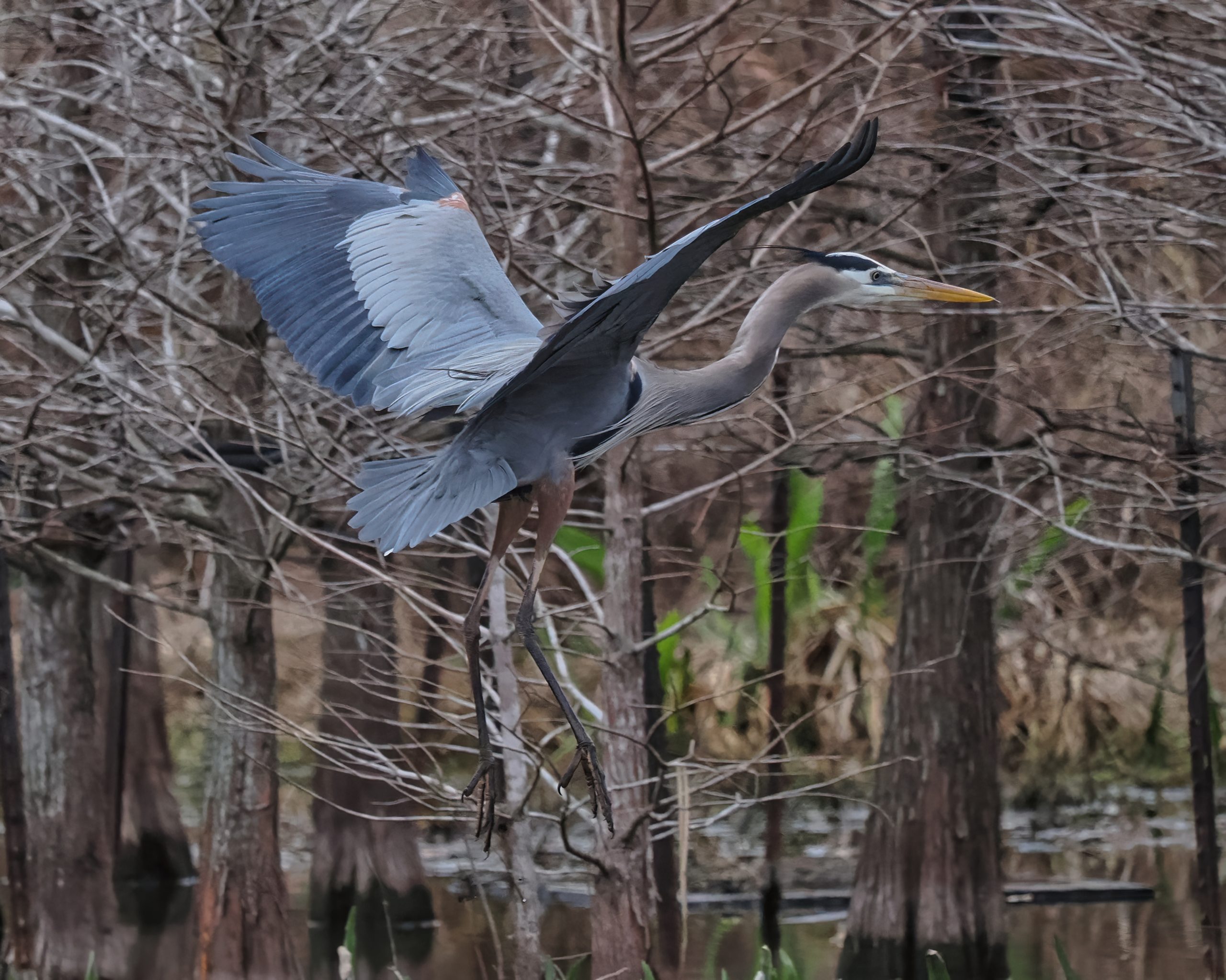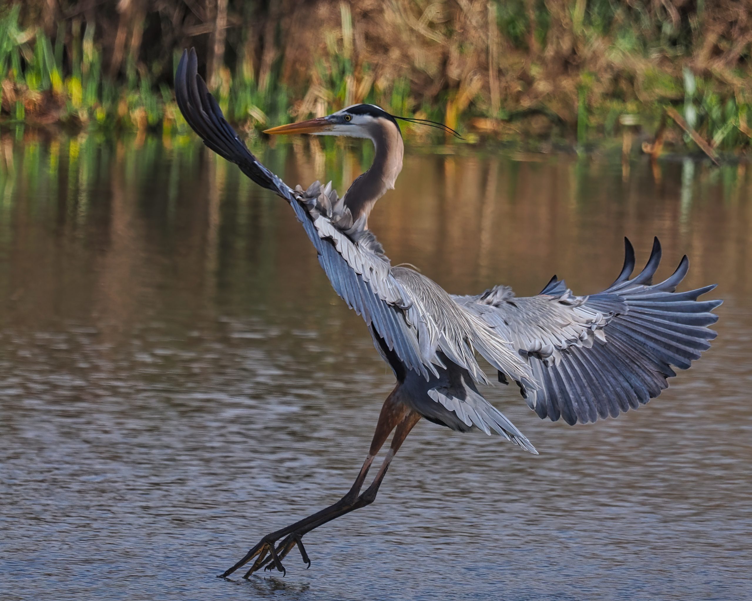 Great Blue Heron touching down in the Riverstone Wetlands, Sugar Land, Texas.
