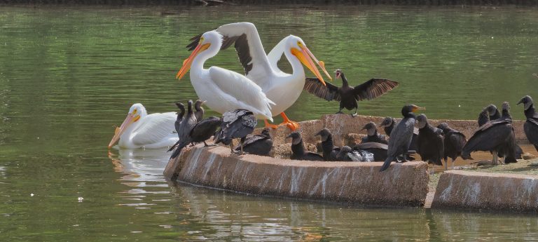 Three American White Pelicans, six (Double-crested?) Cormorants, and twelve Black Vultures all on the end of an island in Edgewater Lake, Sugar Land, Texas. Notice the breeding knobs on the bills of the pelicans.