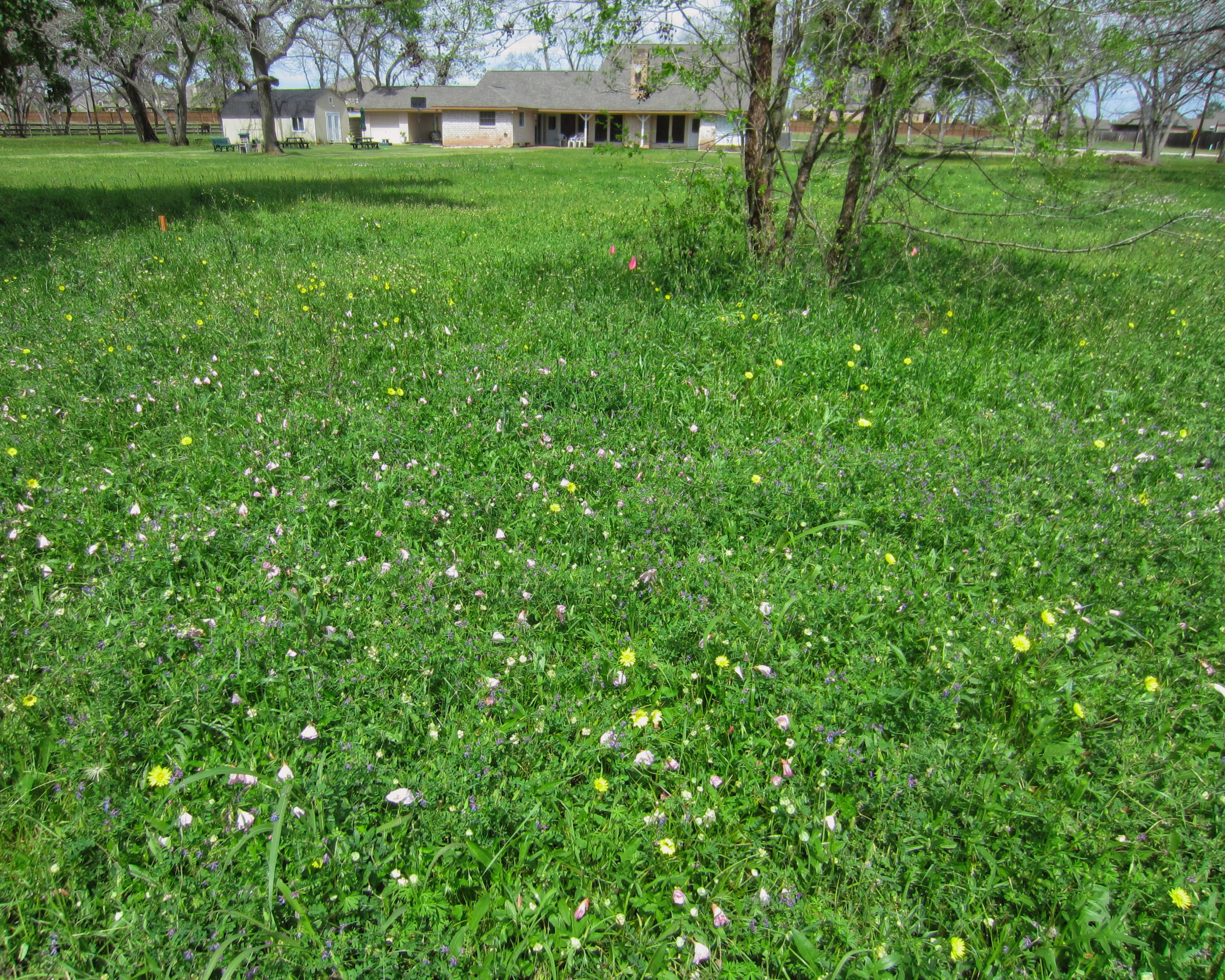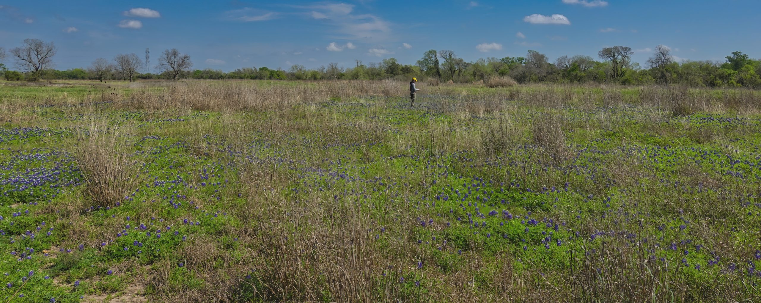 Texas Master Naturalist luxuriating in a field of Bluebonnets mixed with Switch Grass, an ideal, drought-resistent prairie plant with roots 12 feet deep, useful for preventing flooding, located 16 miles NW of Edna, Texas.