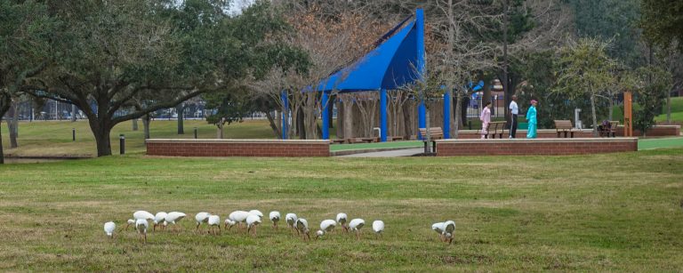 The bocce ball court in the background is used for some sort of physical training, stretching and limbering, I think. The blue sail is a sun and rain umbrella over some permanent tables and chairs set up for chess and checkers. White Ibis (Eudocimus albusare) are foraging in the foreground. Double Lake, Sugar Land, Texas, is to the left. Isn’t it great that a one-inch sensor brings it all into focus? Shallow depth of field is over-rated.
