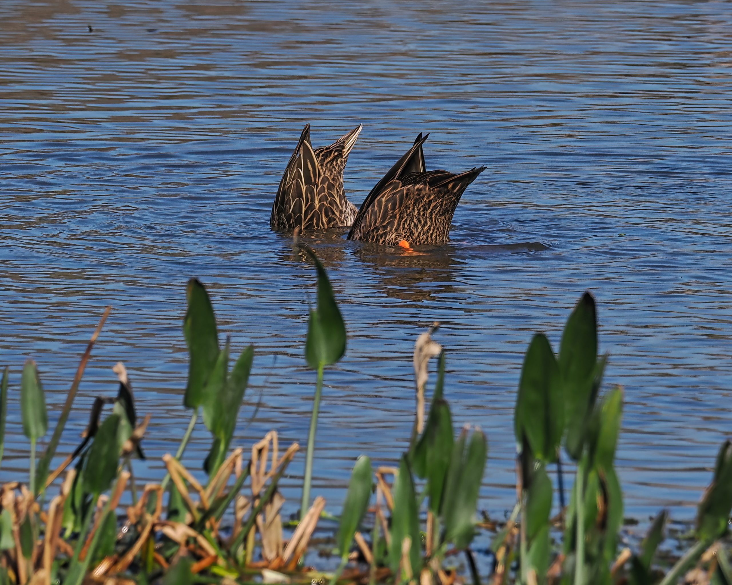 A pair of Mottled Ducks (Anas fulvigula) foraging in the Riverstone Wetlands, Sugar Land, Texas.