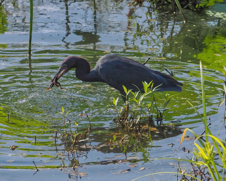 Little Blue Heron (Egretta caerulea) catching something. Fish, frog? Not sure. Cullinan Park, Sugar Land, Texas.
