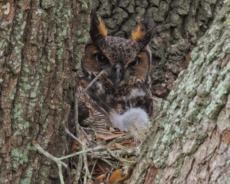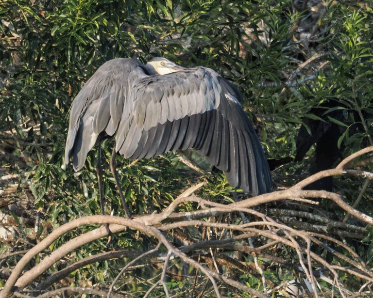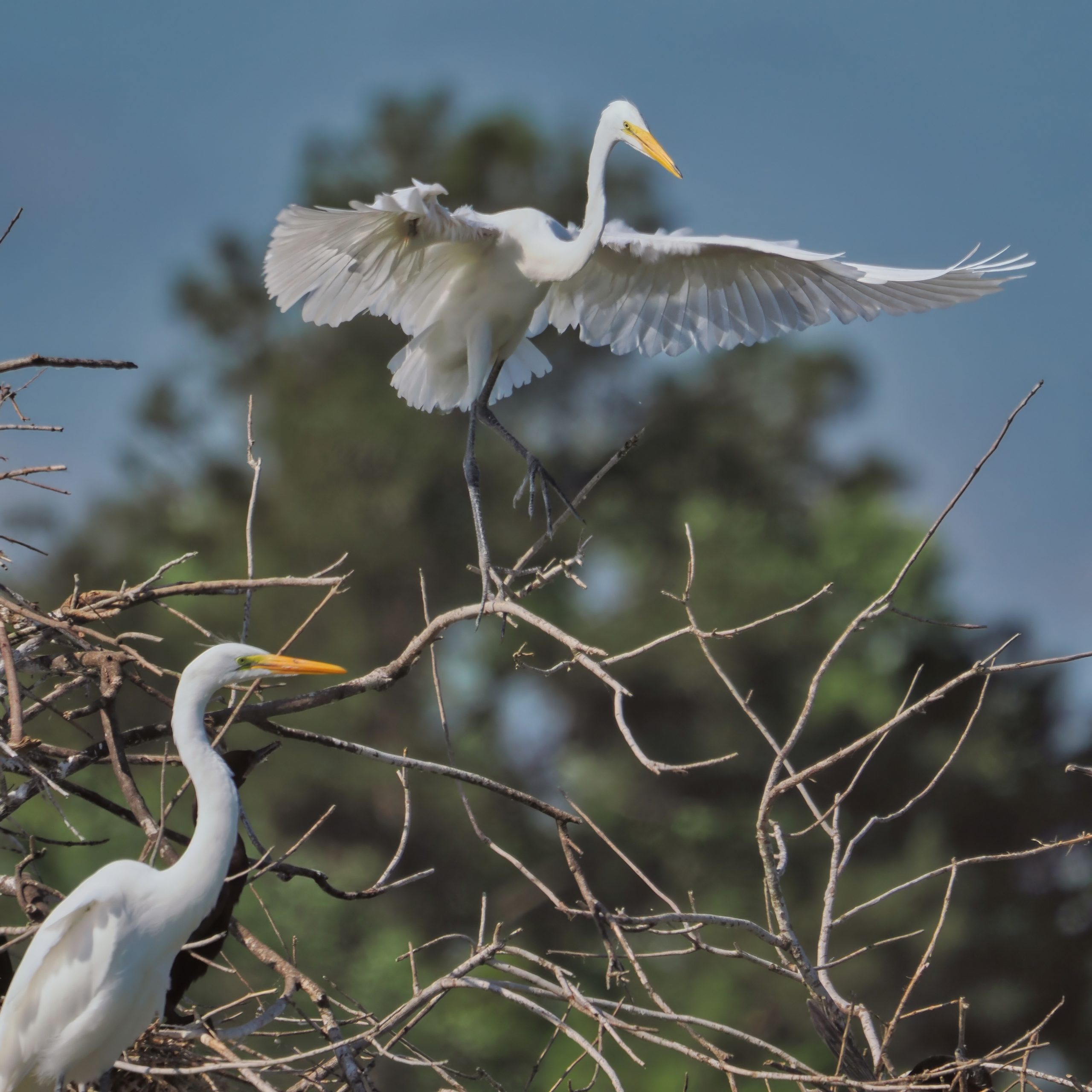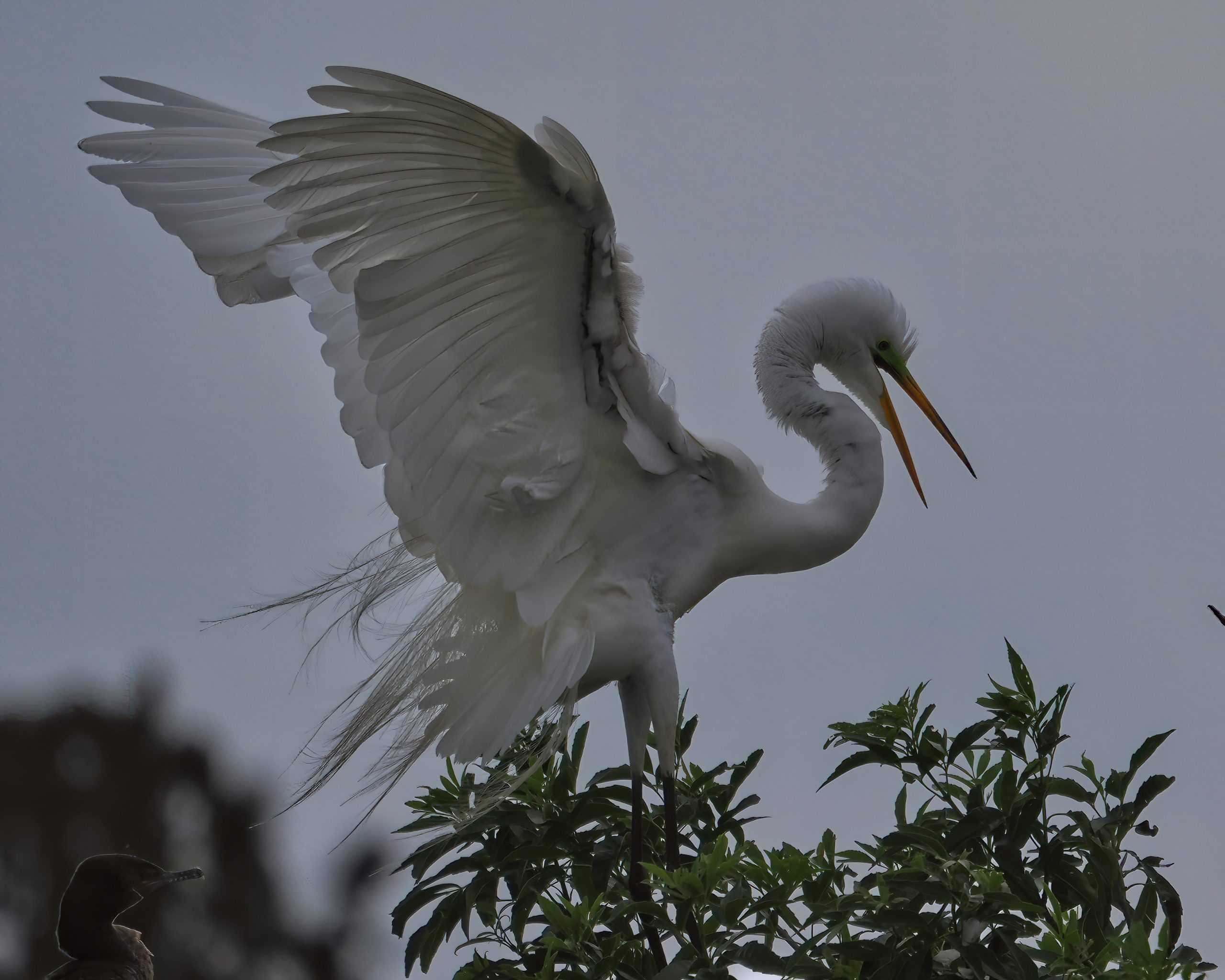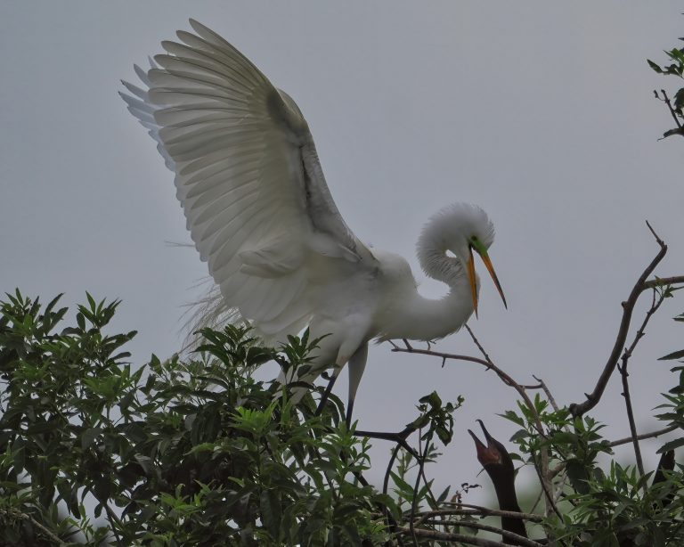 Great Egret in discussion with a Cormorant about the location of its nest. Delores Fenwick Nature Center, Pearland, Texas.