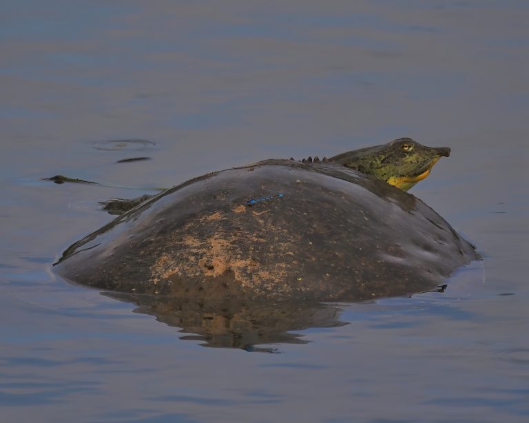 Notice the small Common Bluet (Enallagma cyathigerum), a blue damselfly, on the back of the Spiny Softshell (Apalone spinifera), one of the largest freshwater turtle species in North America. Just the second time I