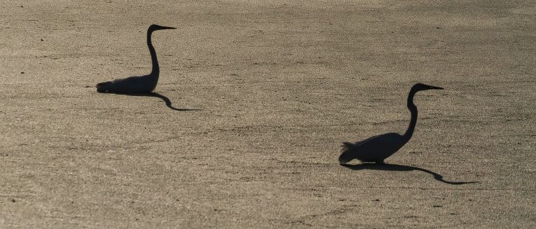Two Great Egrets in silhouette shot into the low-hanging sun, standing in duckweed, normally green, but the