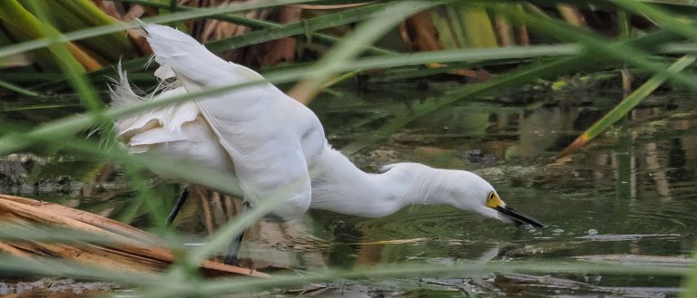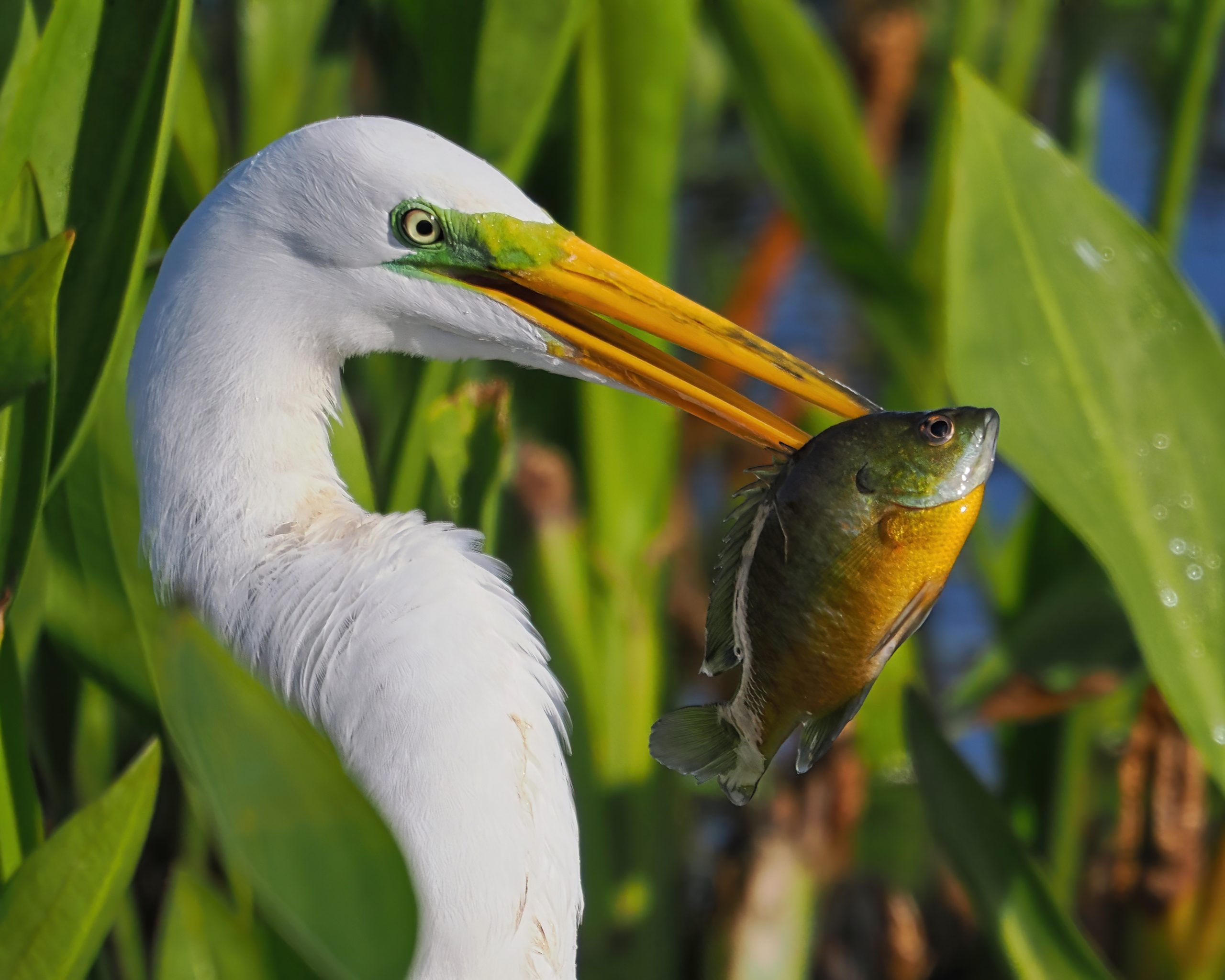 The dominant Great Egret of Riverstone Wetlands (note the increasingly green lore about the eye) uses his lower beak to impale a Bluegill (Lepomis macrochirus). He devoured it whole. Sugar Land, Texas.
