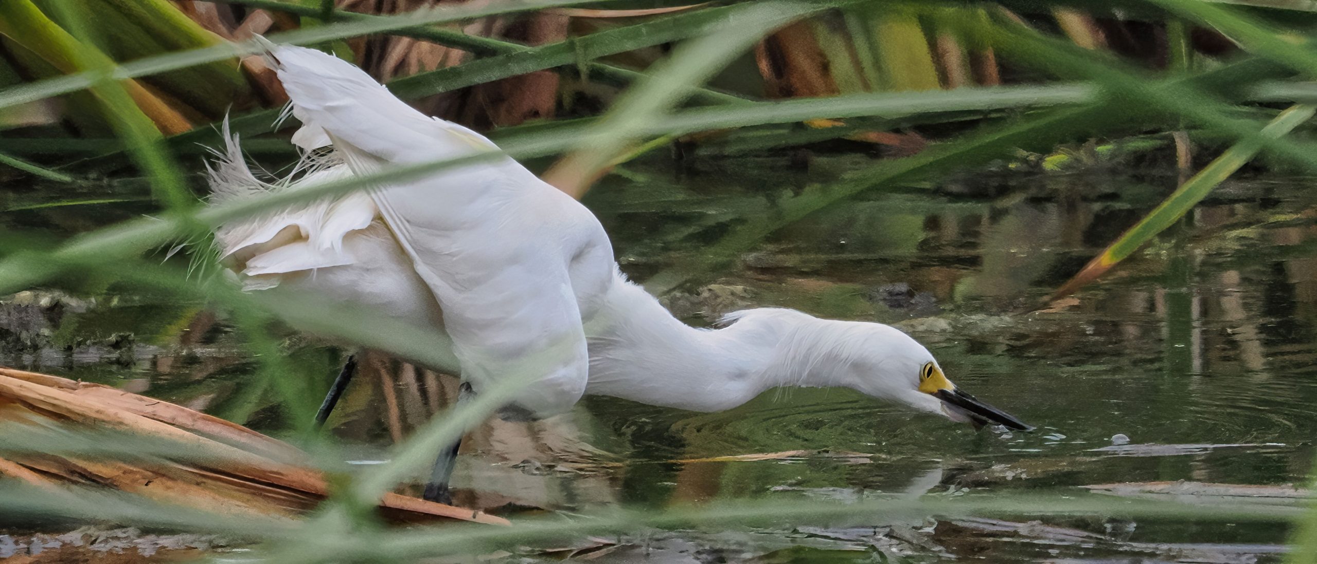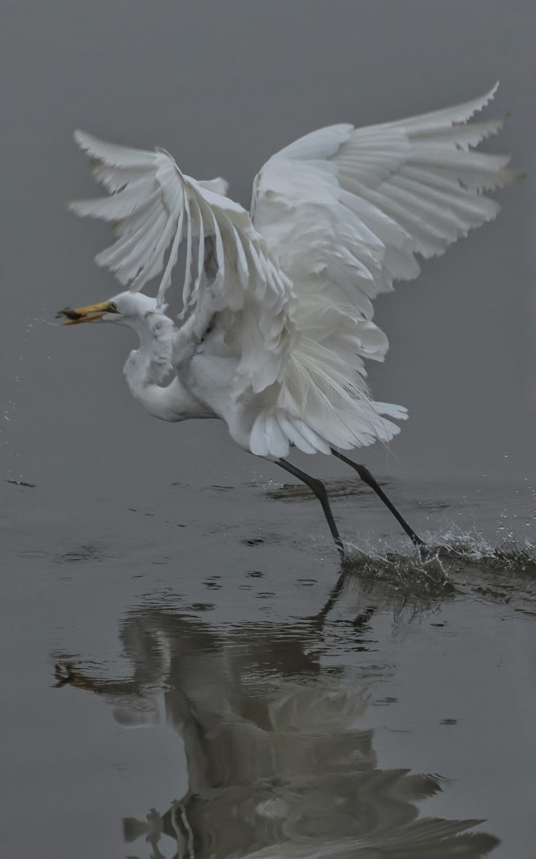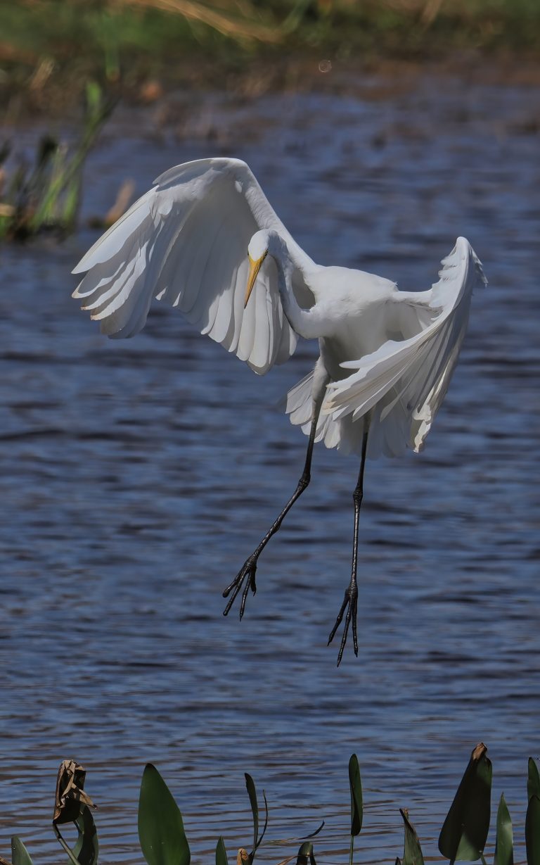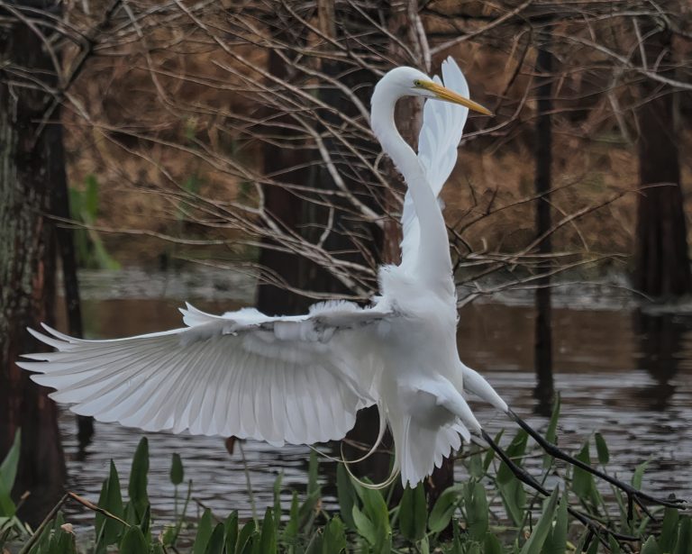 Great Egret screeching to a stop in the Riverstone Wetlands, Sugar Land, Texas.