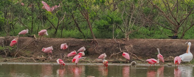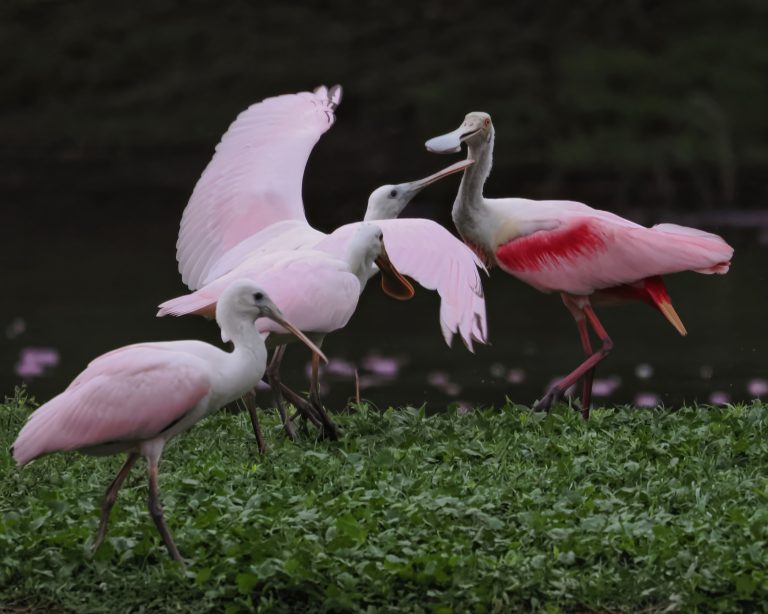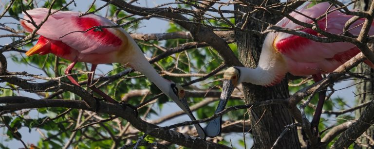 Roseate Spoonbills in bright pink at Delores Fenwick Nature Center, Pearland, Texas.