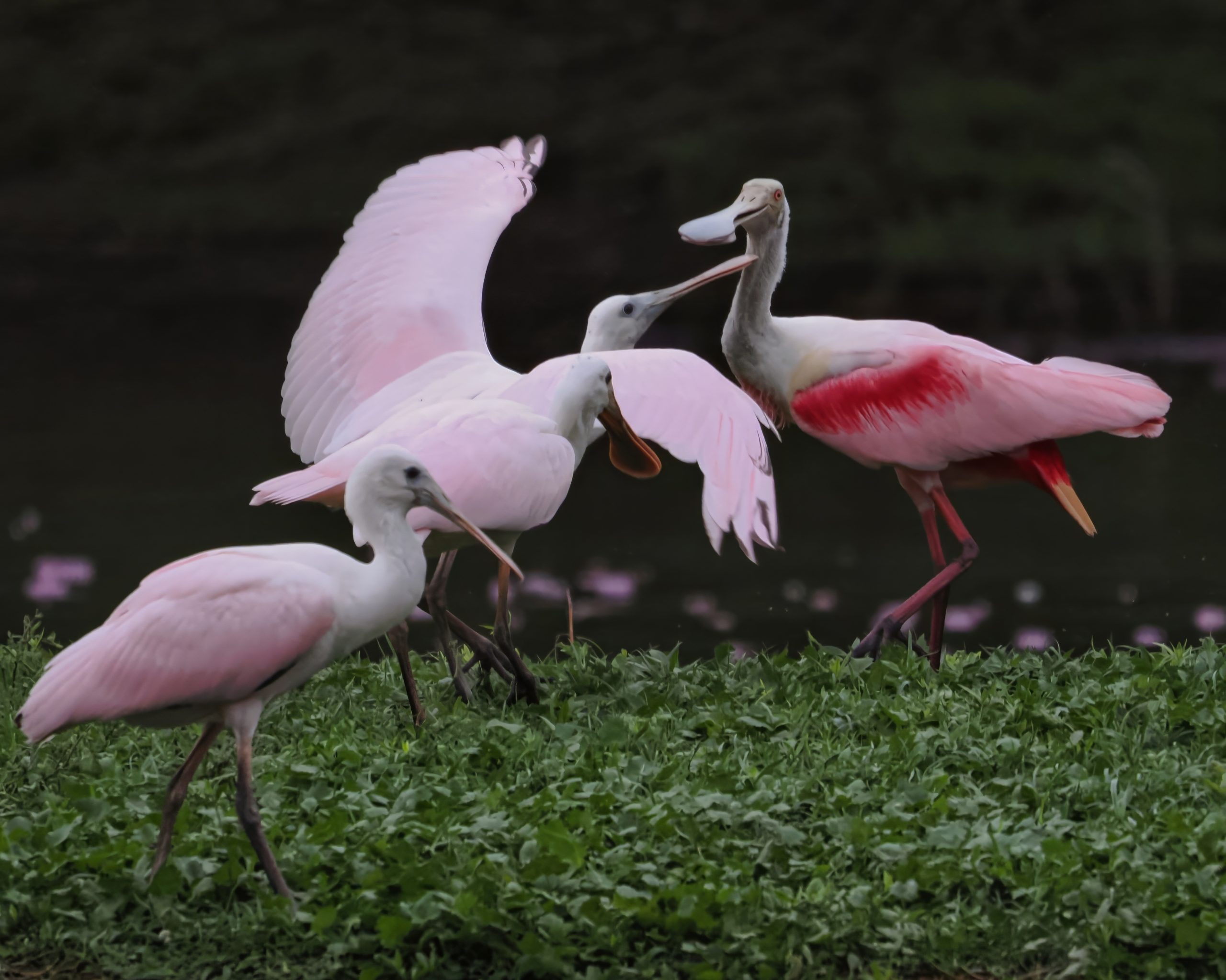 Roseate Spoonbills. Platalea ajaja. Suburban Edgewater Lake, Sugar Land, Texas.