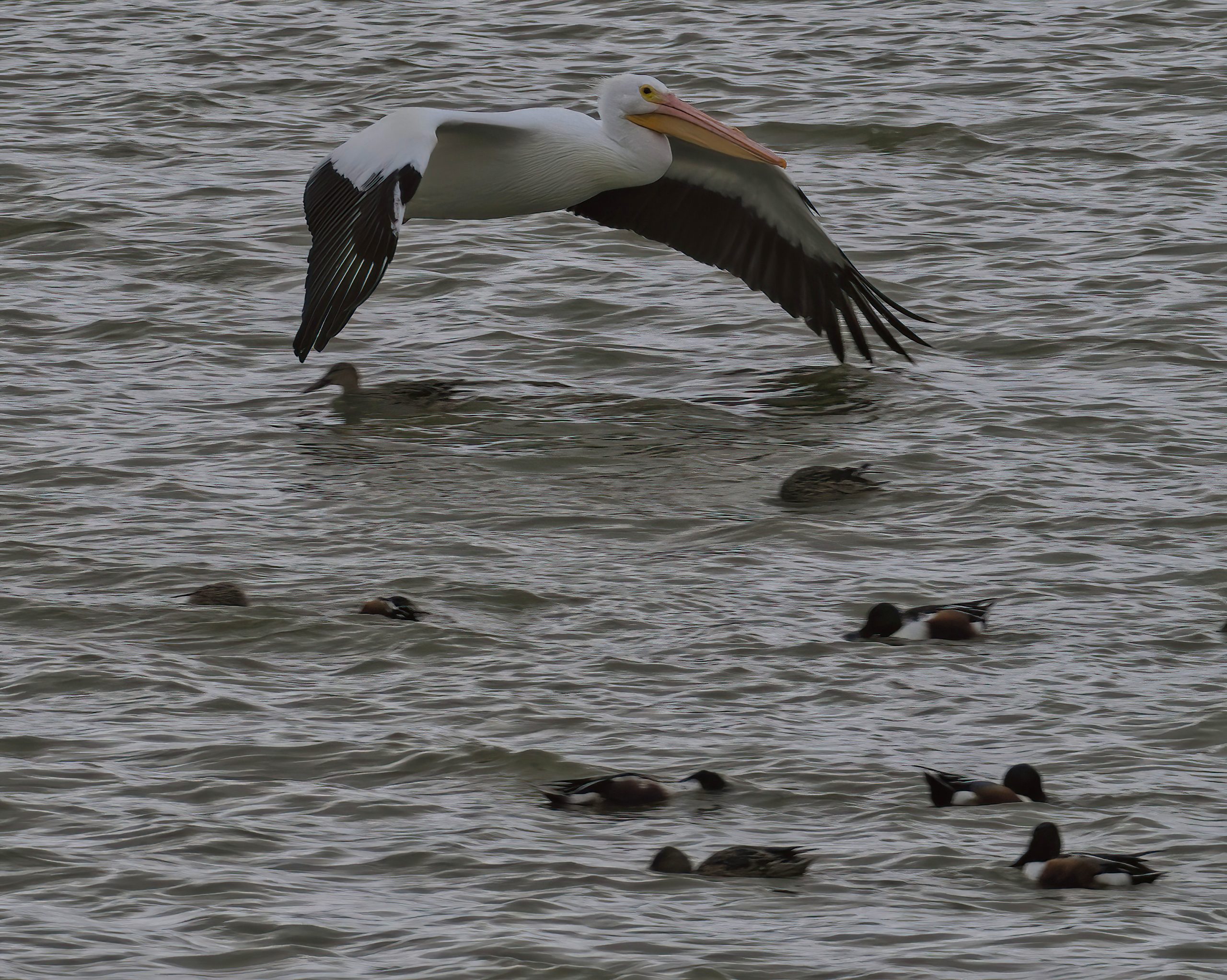 American White Pelicans still over-wintering in Delores Fenwick Nature Center, Pearland, Texas. Northern Shovelers in the pond.