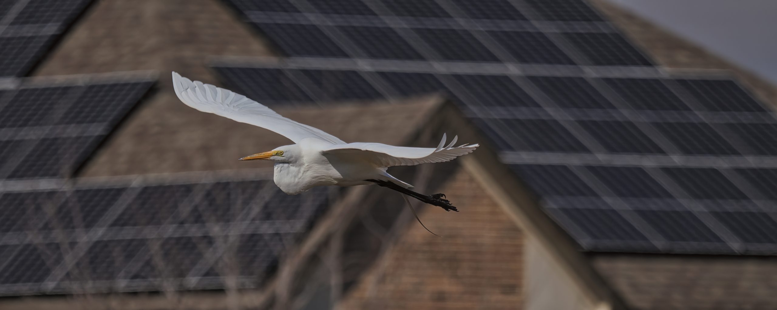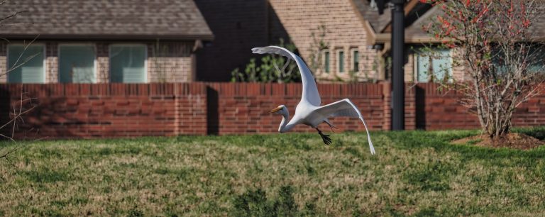 Great Egret flying through the neighborhood. Riverstone Wetlands, Sugar Land, Texas.