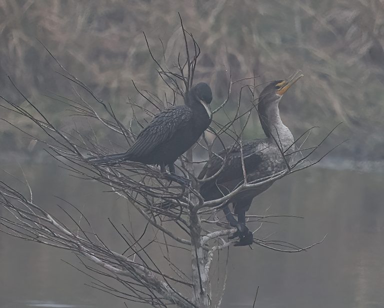 Two Cormorants in a Bald Cypress, Riverstone Wetlands, Sugar Land, Texas. One Double-crested, for sure, the other may be Neotropic. Strange.