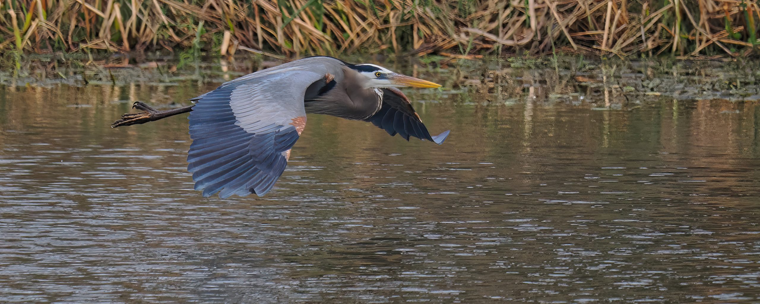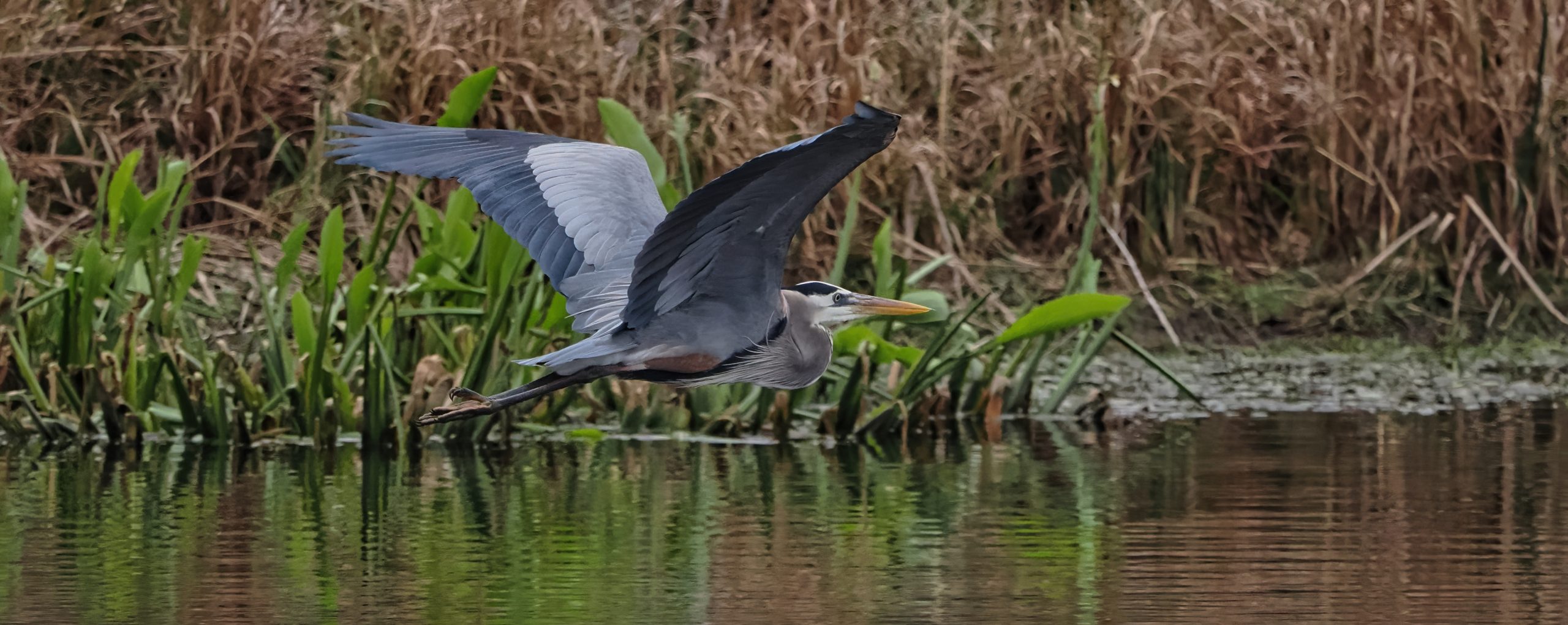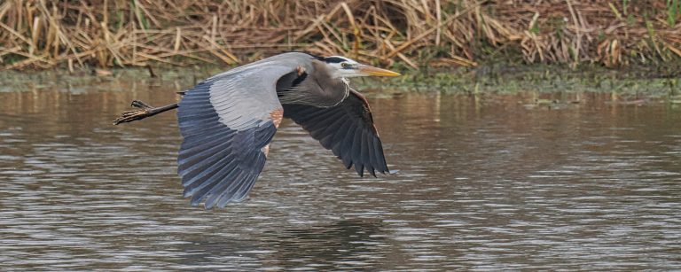 Resident Great Blue Heron crossing the Riverstone Wetlands on a wintry day with reeds in the background. Sugar Land, Texas.