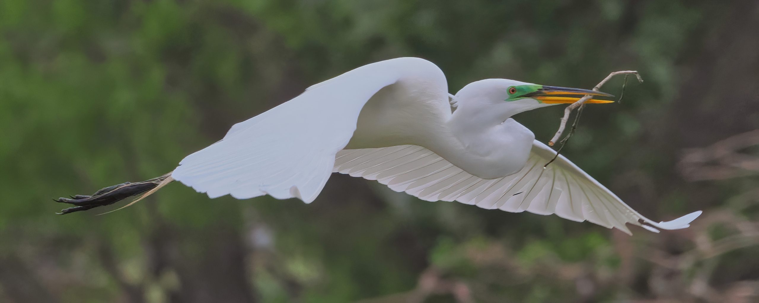 One day into the season of Spring this Great Egret is carrying sticks for a nest in the rookery at Resoft County Park, Alvin, Texas.