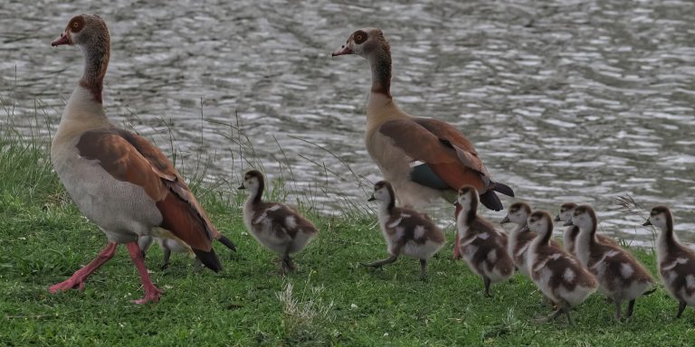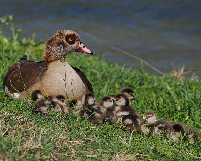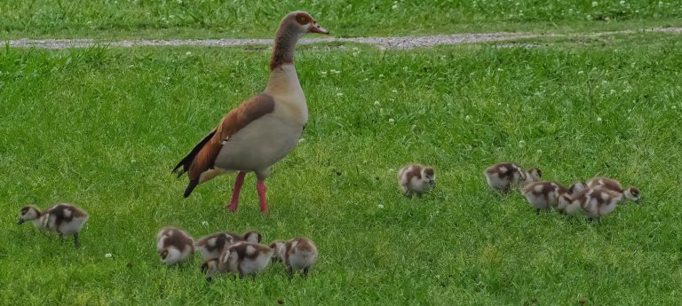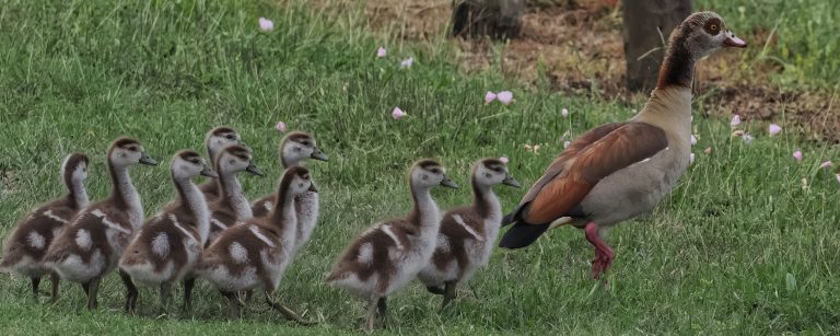 Egyptian Goose and her ten goslings. Don