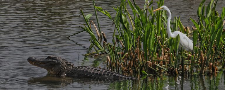 I waited patiently (10-15 minutes) for the Great Egret to walk / jump / fly onto the back of the American Alligator, but it didn