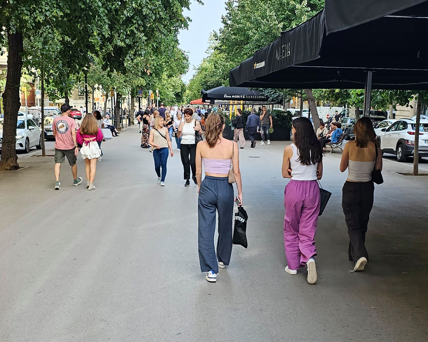 Pedestrian thoroughfare, Barcelona, Spain, not far from our AirBnB, returning after an early dinner of tapas (appetizers), and beer, of course, on our first day (of three) in the city.