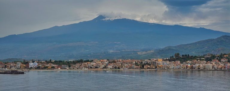 Notice the snow on the peak high in the clouds. Mount Etna is one of the world’s most active volcanoes. It has been designated a Decade Volcano by the United Nations and a World Heritage Site by UNESCO. The peak is 3,357m. We drove up over 2,000m to view some secondary craters (along with many other tourists). Mount Etna most recently erupted on May 22, 2023, two weeks before our arrival. The town of Giardini Naxos (in Sicily) is in the foreground.
