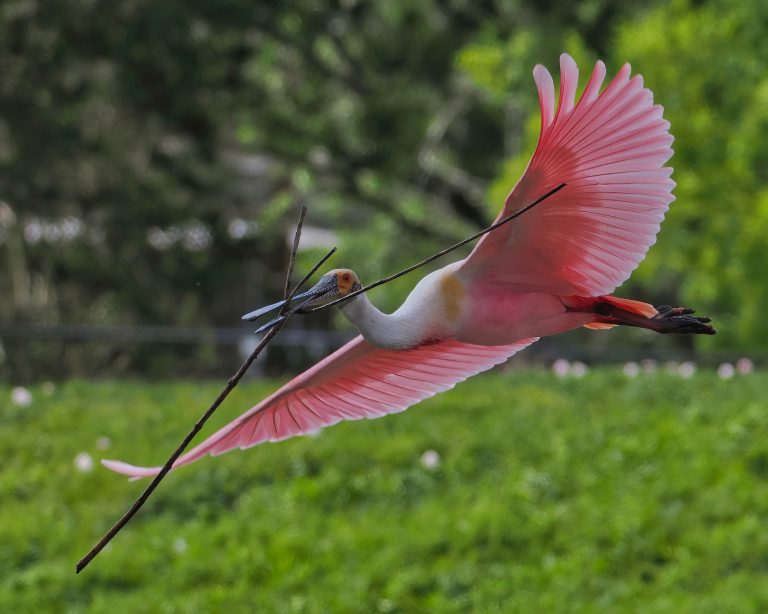 Roseate Spoonbill carrying sticks to the rookery at Resoft County Park, Alvin, Texas. Notice the filigree pattern on the bird