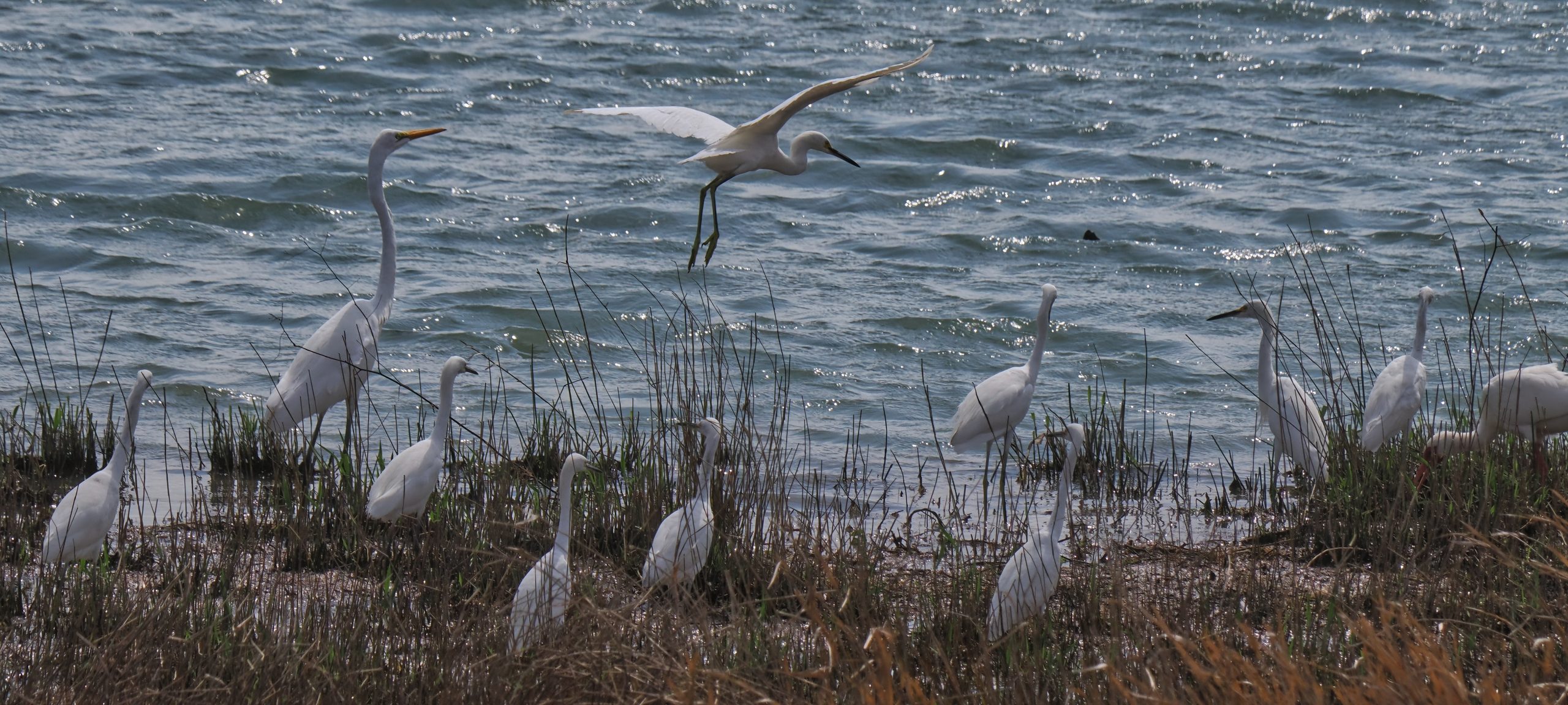 Dreary day but the Egrets were flying in the Riverstone Wetlands, Sugar Land, Texas.