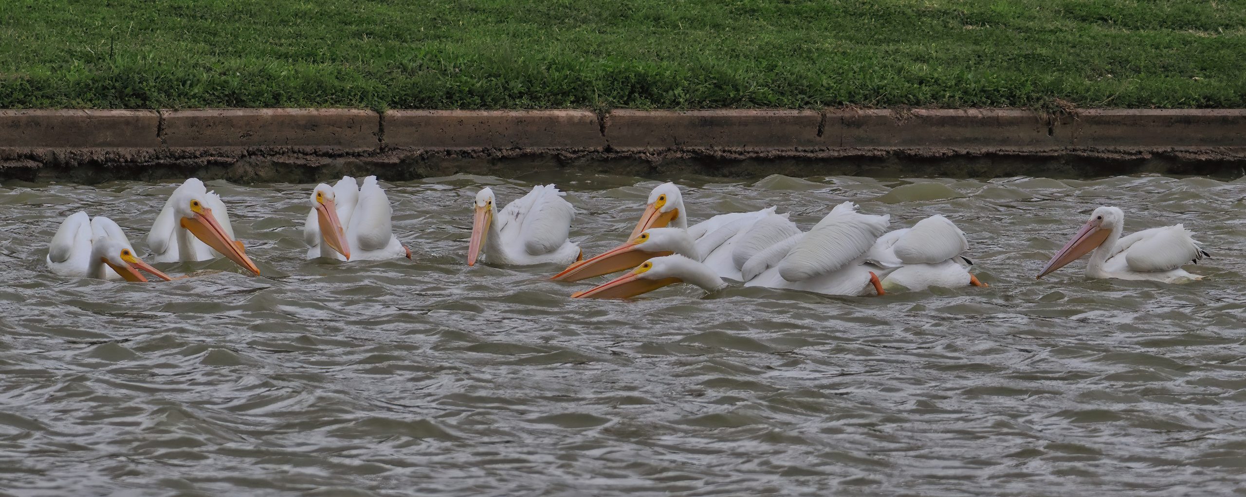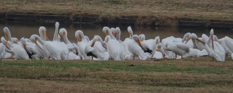 American White Pelicans are still over-wintering in Delores Fenwick Nature Center, Pearland, Texas, lots of them, and fishing in groups.