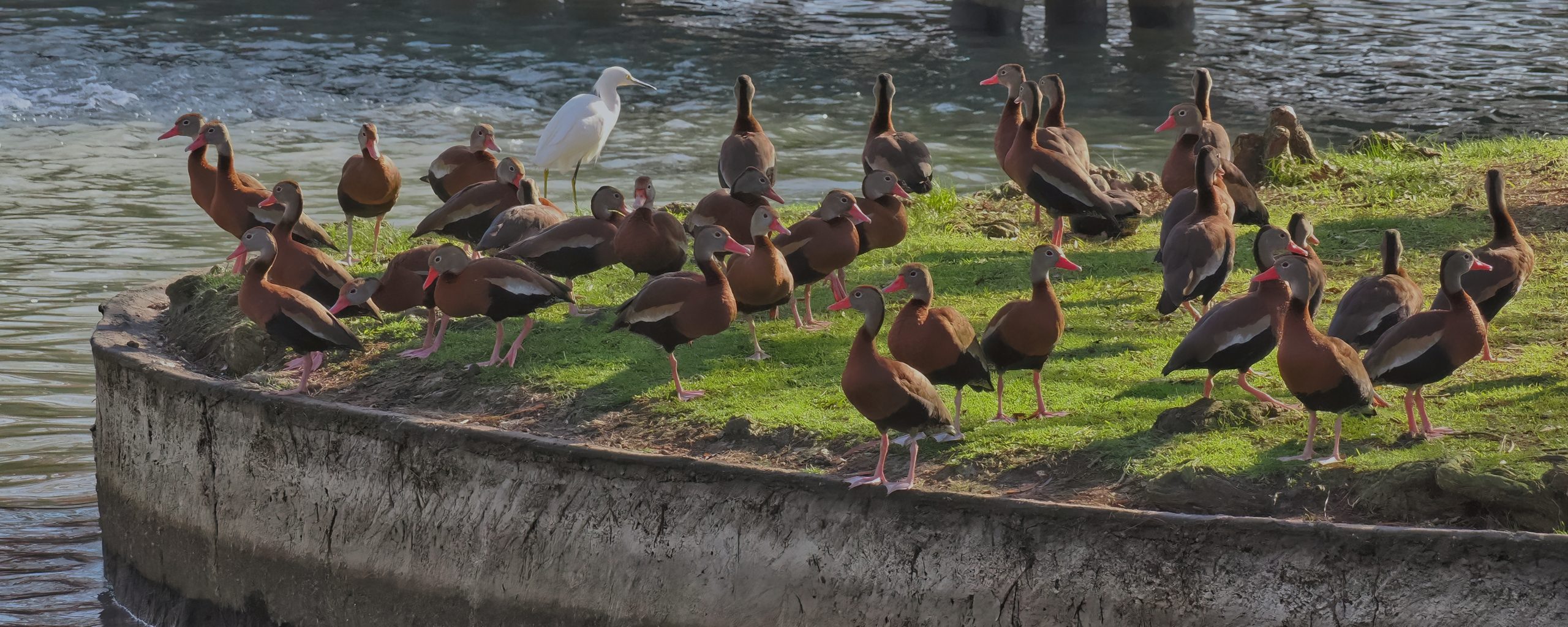 Thirty-five Black-bellied Whistling Ducks and one Snowy Egret. McGovern Lake, Hermann Park, Houston, Texas.