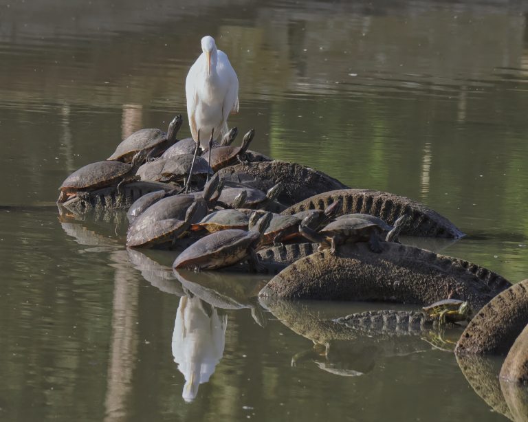 The construction of pilings for a new bridge over McGovern Lake in Hermann Park required the damming of part of the lake and pumping it (sort of) dry. This exposed a row of truck tires upon which turtles congregated. Then a Great Egret came along and this photo. Houston, Texas. No idea why the tires are there!