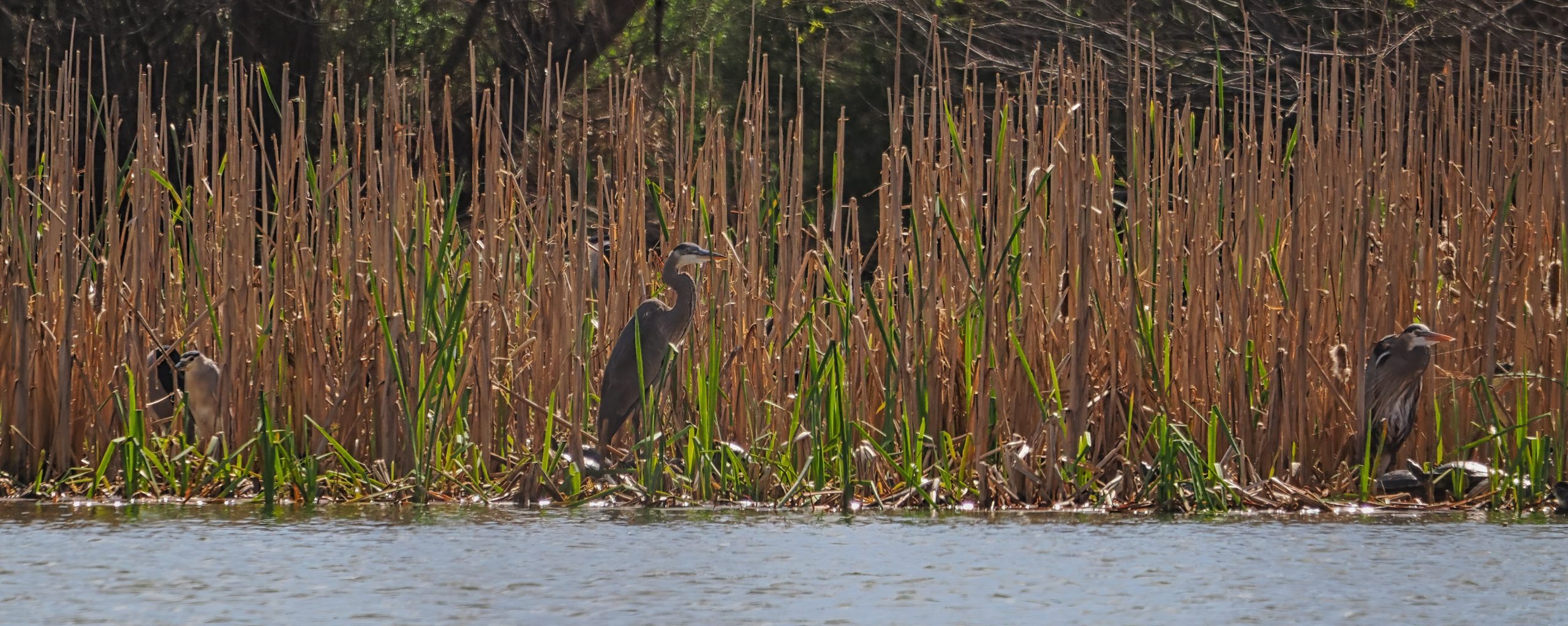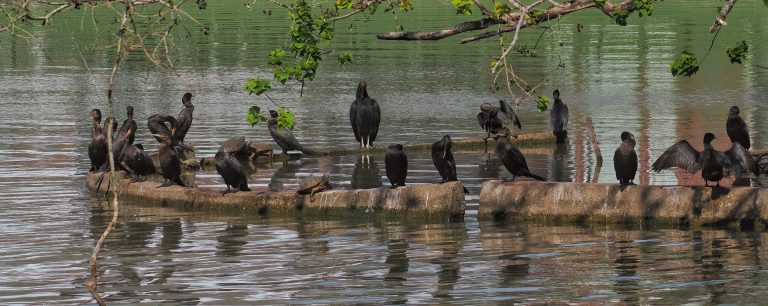 The polishing pond at Cross Creek Ranch in Fulshear, Texas, was once full of avian species, especially large water birds. But a new freeway nearby, new apartments nearby and new additions to the sewerage plant nearby have caused the birds to retreat to few reedy patches in greatly reduced numbers. Here they are, some of them, Black-drowned Night Herons, Great Blue Herons and a few turtles, too. Still, a nice photo.