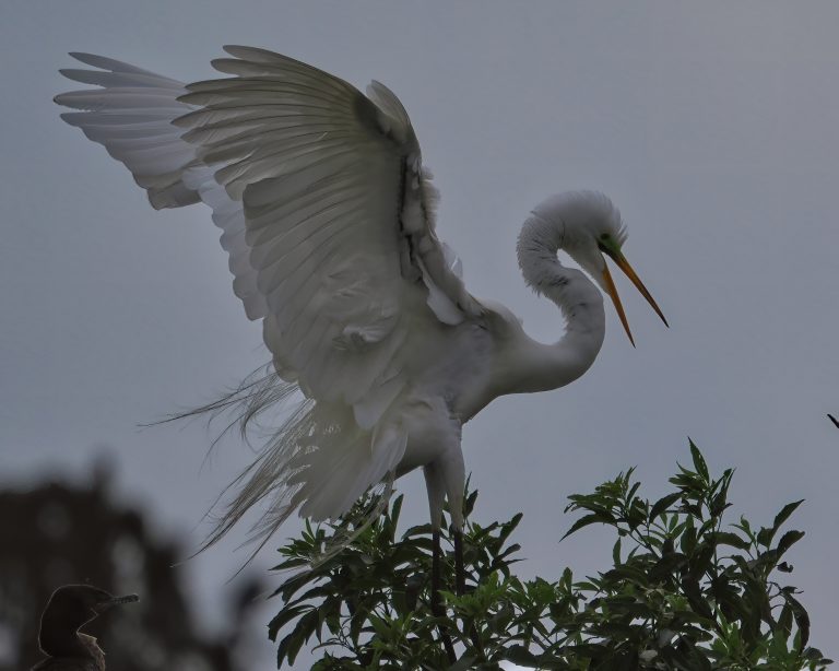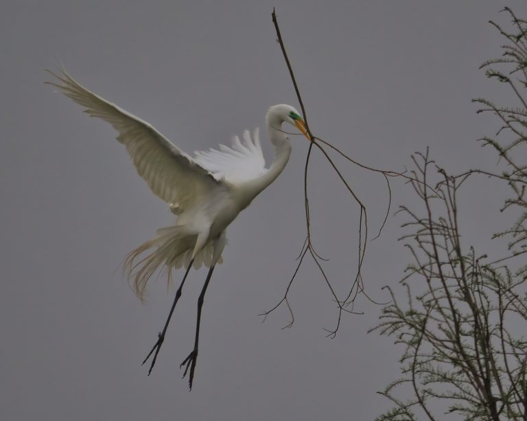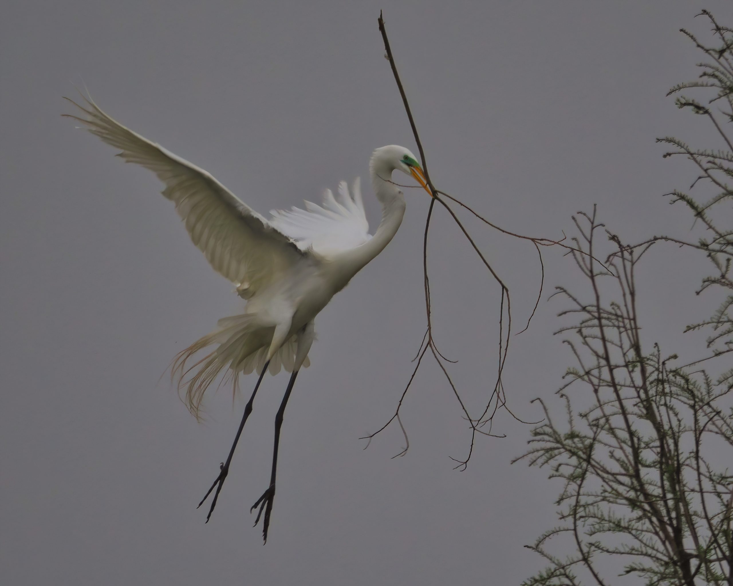 Different perspective, one second later. Great Egret building a nest on a dreary morning. Resoft County Park, Alvin, Texas.
