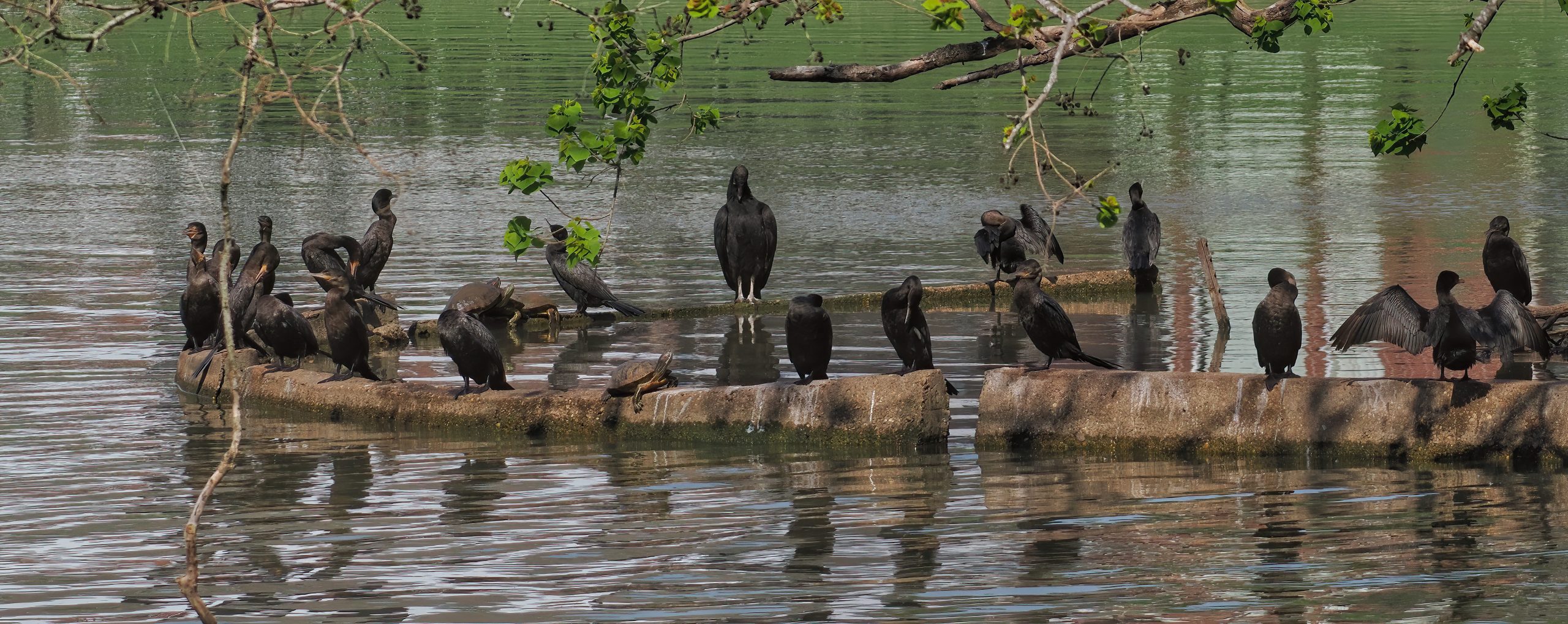 Two Red-eared Sliders (turtles) and one Black Vulture. A different island in Edgewater Lake, Sugar Land, Texas.