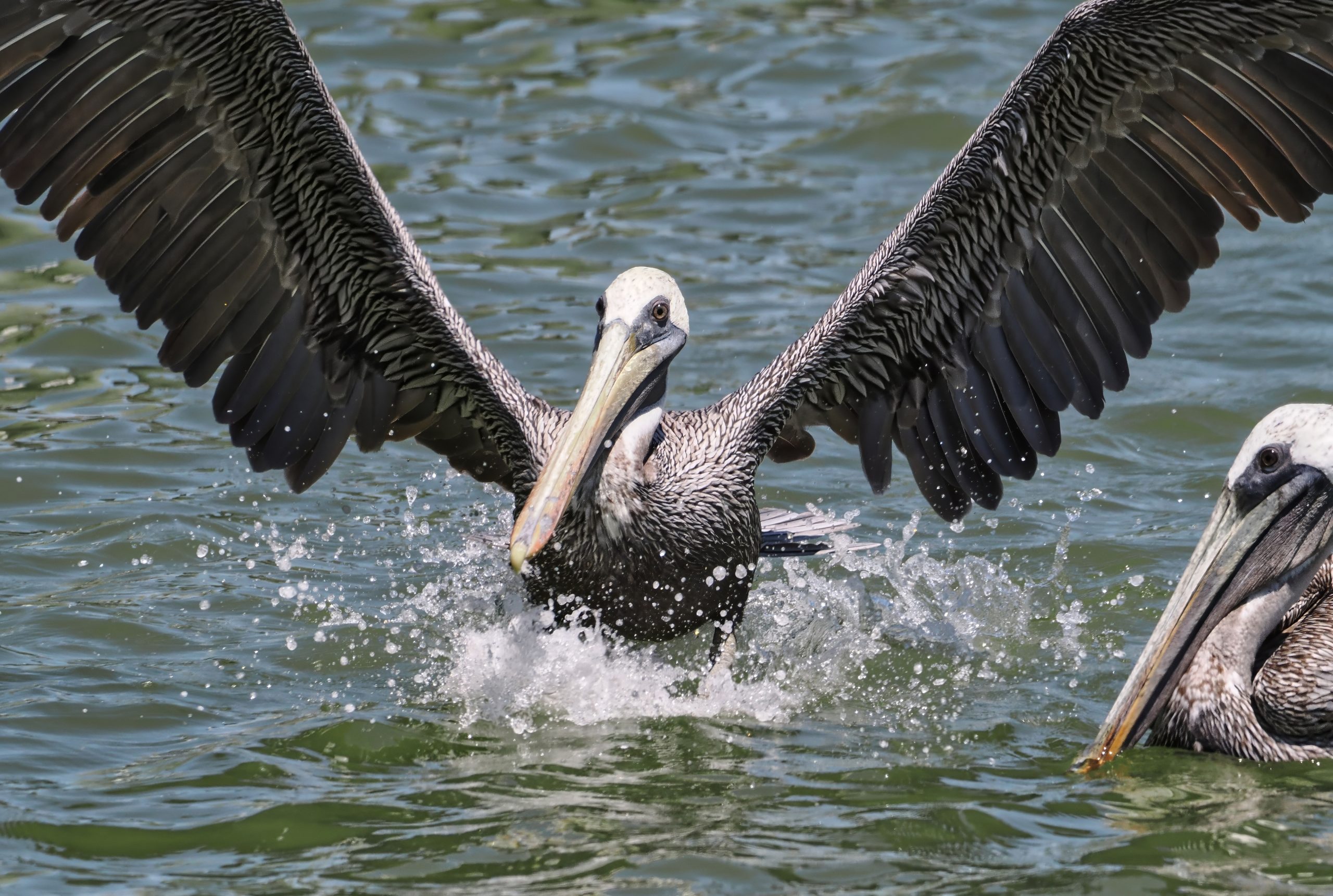 Brown Pelican (Pelecanus occidentalis) over The Packery Channel between the southern tip of Matagorda Island and the northern tip of Padre Island, near Corpus Christi, Texas. Anhinga anhinga. Smith Oaks Audubon sanctuary, High Island, Texas.