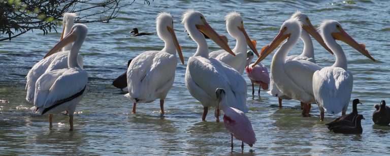Inhabited by Roseate Spoonbills but also American White Pelicans, one seen here on the right. Delores Fenwick Nature Center, Pearland, Texas.