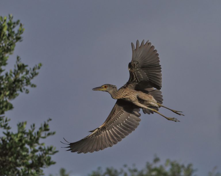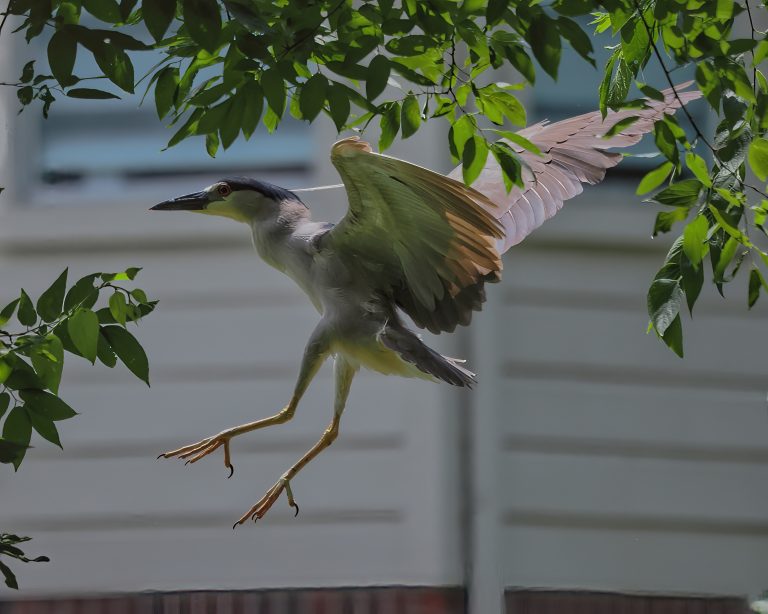 Black-crowned Night Heron flying into its nest on Edgewater Drive, Sugar Land, Texas. The island in Edgewater Lake opposite Waters Way Drive in the First Colony suburban development has always been populated with vultures and water birds, a photographer