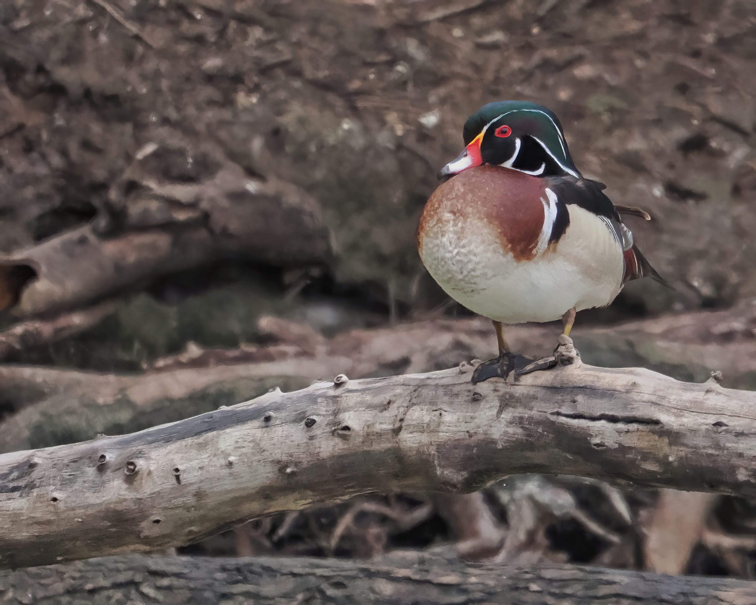 Male Wood Duck keeping dry on an island in Resoft County Park, Alvin, Texas.