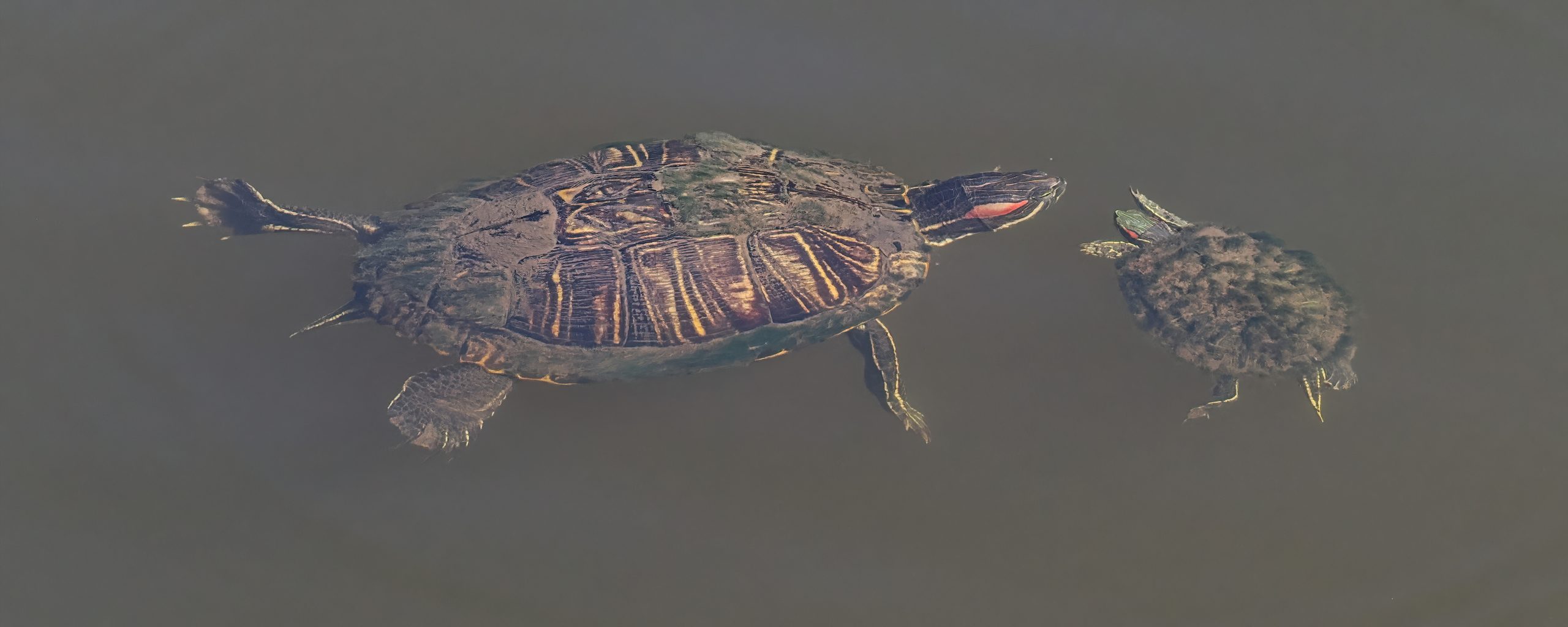 The small turtle (Red-eared Slider) is continually maneuvering to snuggle up face-to-face with the larger turtle. But the big turtle continually brushes off the little guy. Amazing to me that turtles have a social life! Riverstone Wetlands, Sugar Land, Texas.