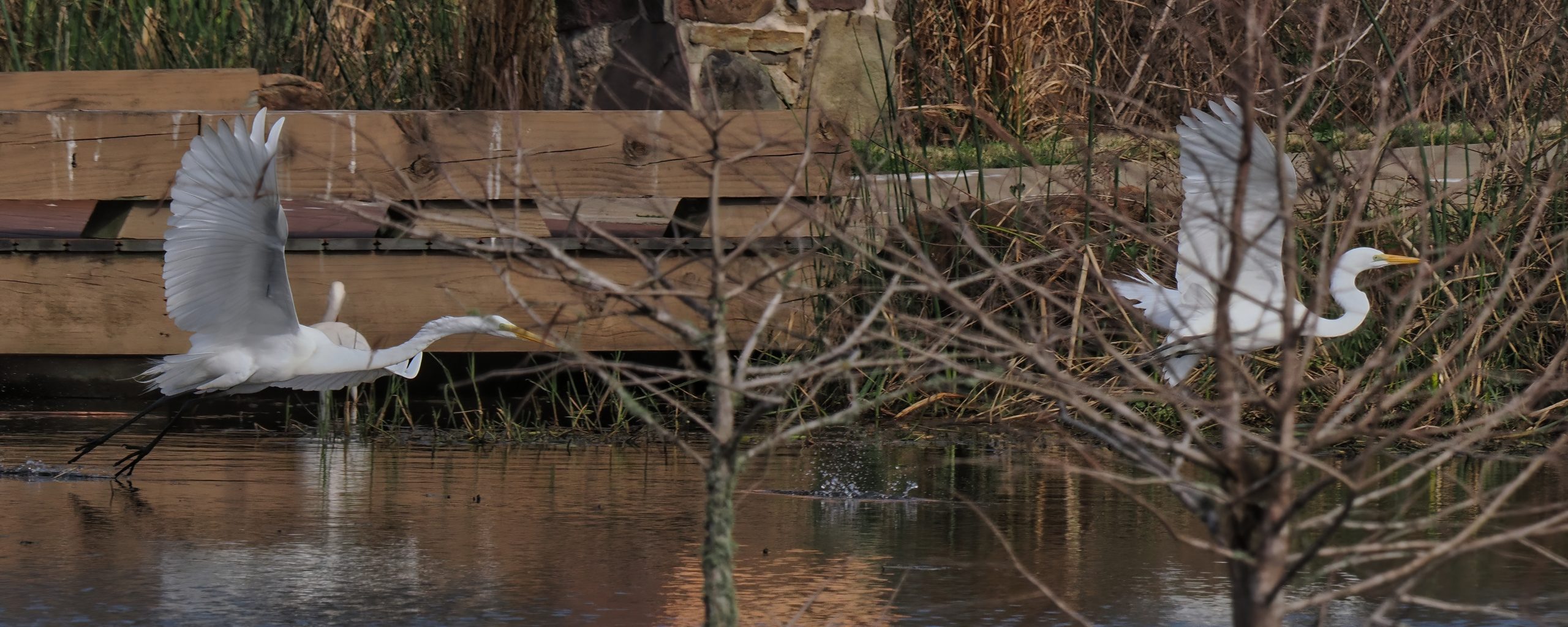 The dominant Great Egret of Riverstone Wetlands is chasing a competitor out of his territory. Sugar Land, Texas.