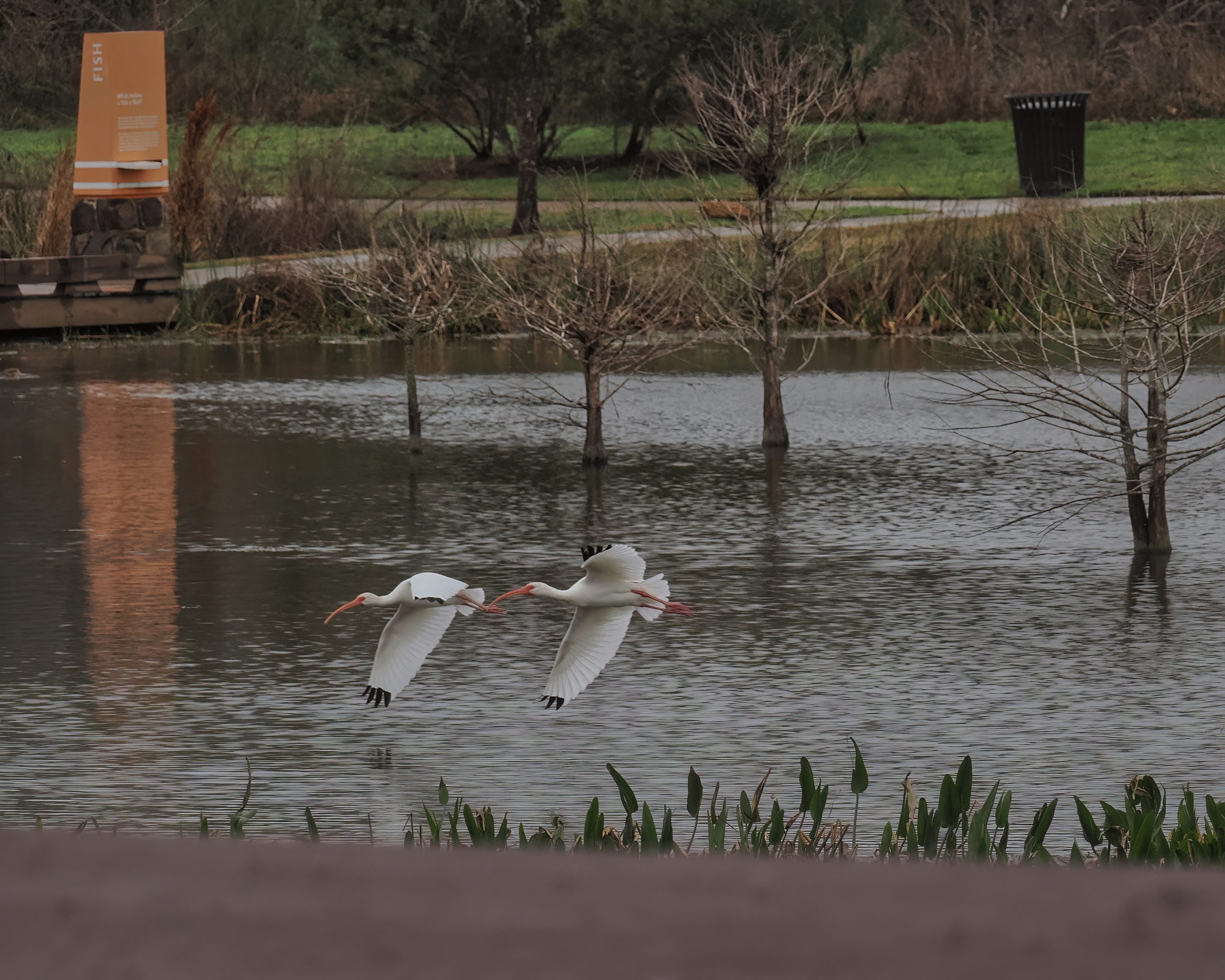A view from the observation platform of Riverstone Wetlands, a pair of Ibis passing by. Sugar Land, Texas.