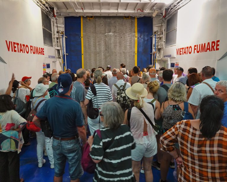No Smoking. Precariously queuing for departure from the hydrofoil landing craft ferrying people from Capri to Naples, Italy, just in time I might add for the ongoing cruise.