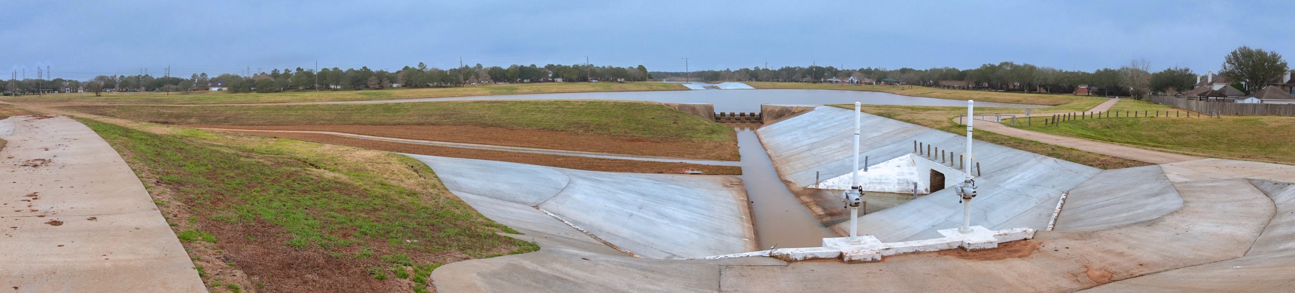 First panoramic photo with the RX100M7, the water works at Double Lake. Double Lake comprises two manicured retention ponds that are connected, managed during flood conditions and which flow into Steep Bank Creek. Steep Bank Creek flows south to the Brazos River passing by Riverstone Wetlands (my favorite birding spot) on the way. Though manicured, Double Lake does attract water birds. Here you see the connection between the two lakes in the distance and the crenelated weir that spills fish as well as water, being a favorite fishing spot for egrets and herons. Steep Bank Creek is immediately to the rear of the photographer standing on the recently-raised levee that protects homes from flood conditions (we hope). Sugar Land, Texas.
