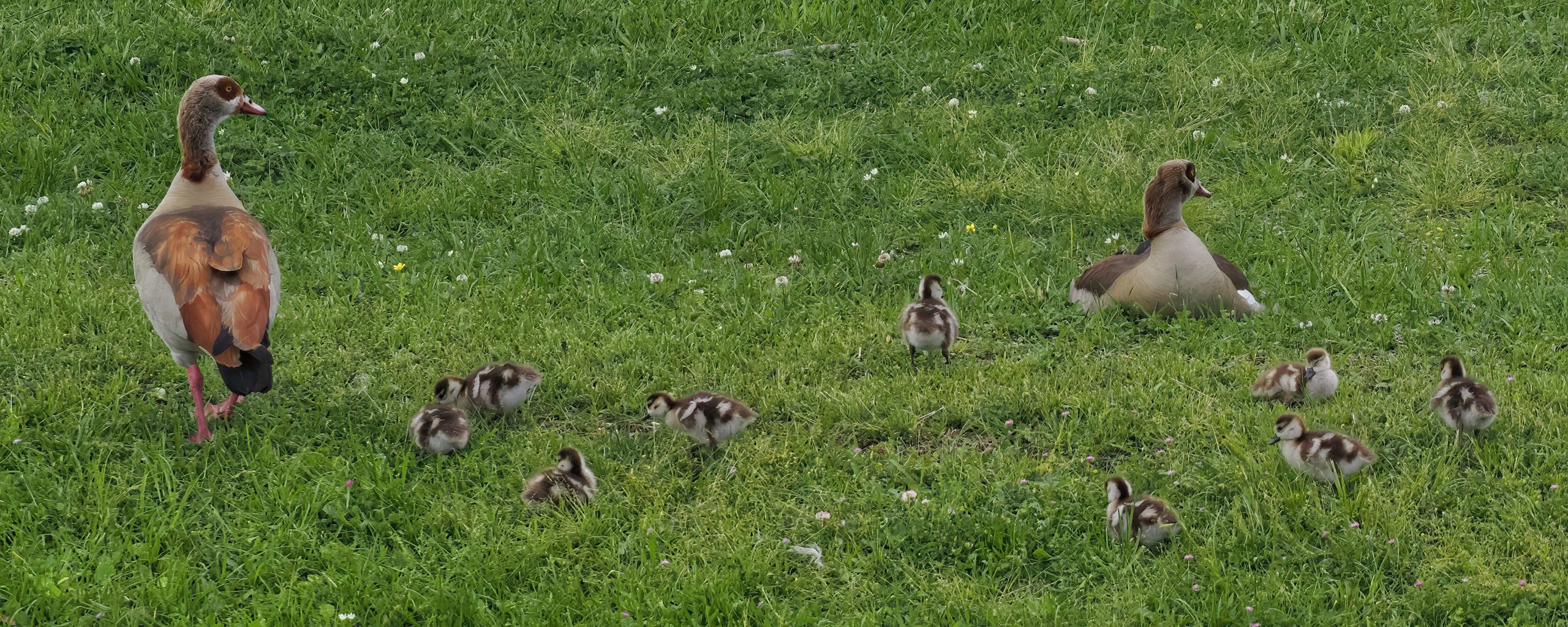 Mom and Dad Egyptian Geese and their nine (surviving) goslings, who seem to dine contentedly on whatever is in the grass. Resoft County Park, Alvin, Texas.
