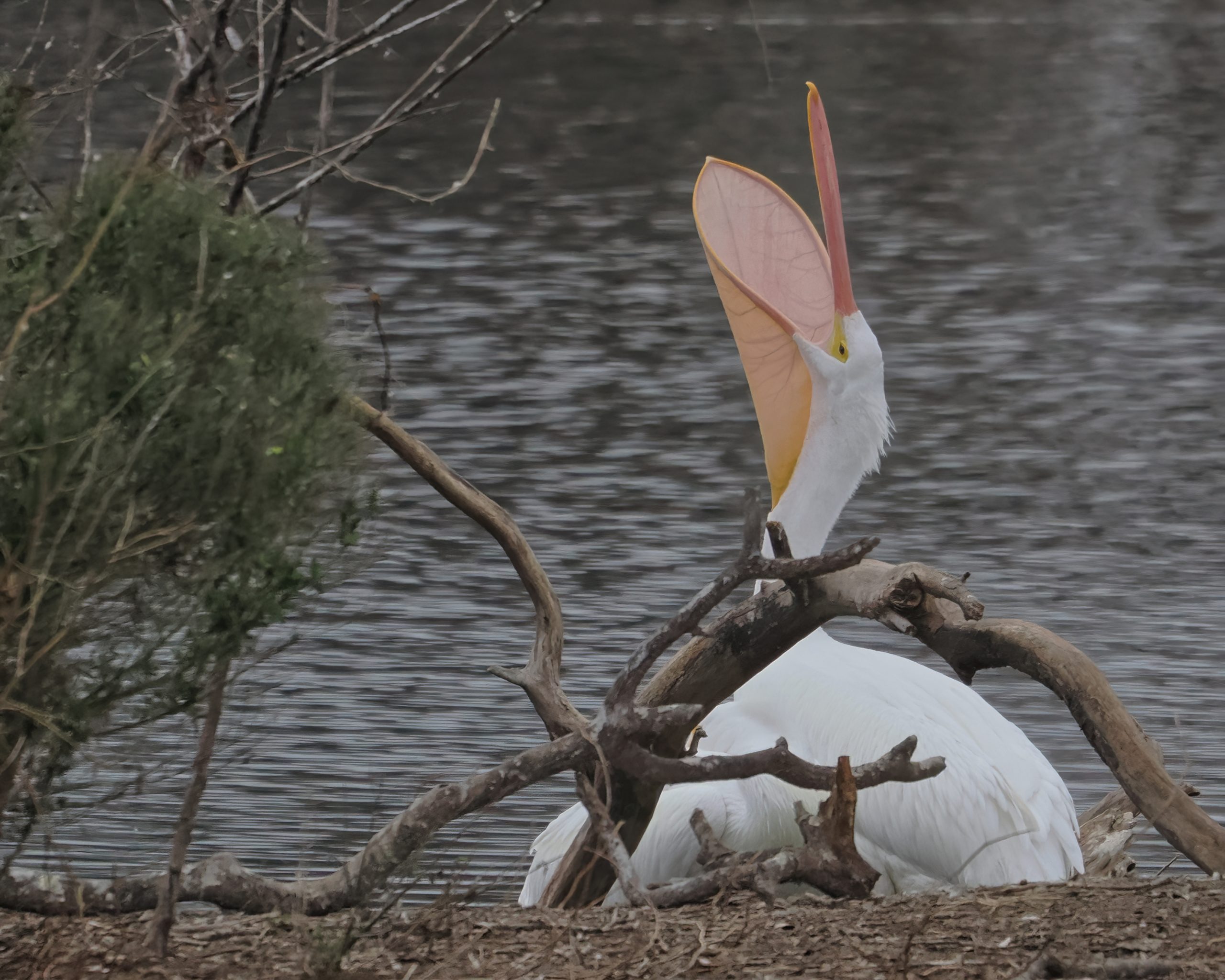 American White Pelican. Maybe yawning. Not observed this behavior before. Suggestions welcome. Delores Fenwick Nature Center, Pearland, Texas.